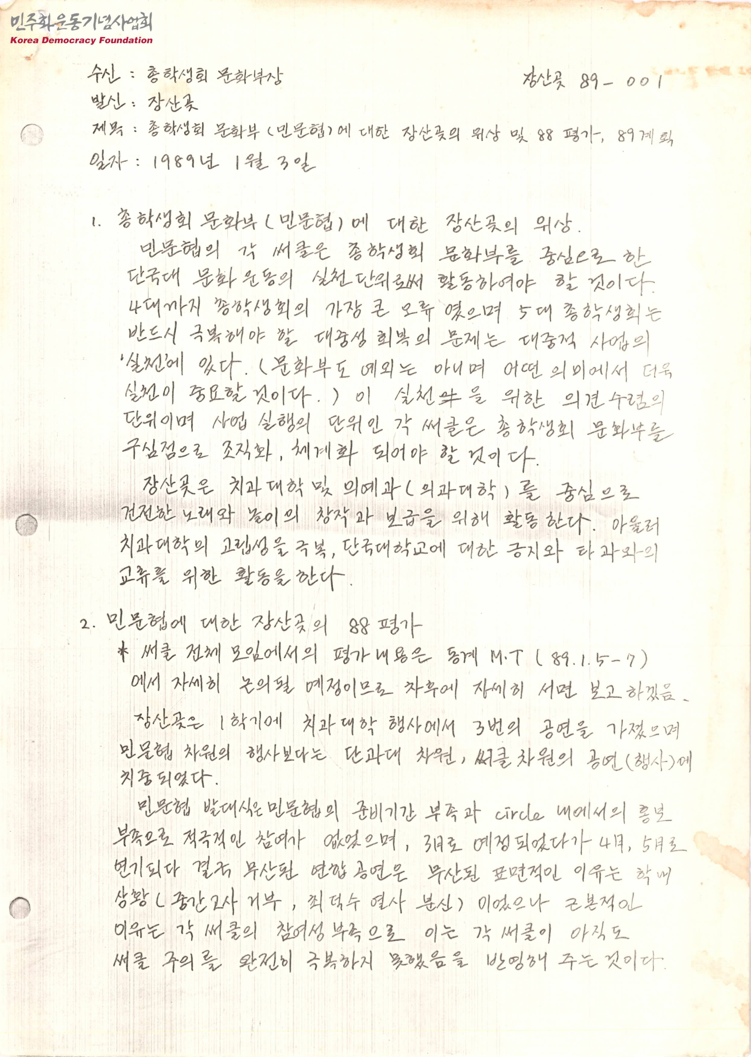 - 민중문화운동협의회의 각 서클은 실천단위로서 활동해야 된다는 것, 장산곶은 치과대학의 고립성을 극복하기 위해 타과와의 교류를 위한 활동을 한다는 것, 발대식을 포함한 88년도 활동에 대한 평가, 조직개편을 포함한 89년도의 계획 등이 수록된 문서
