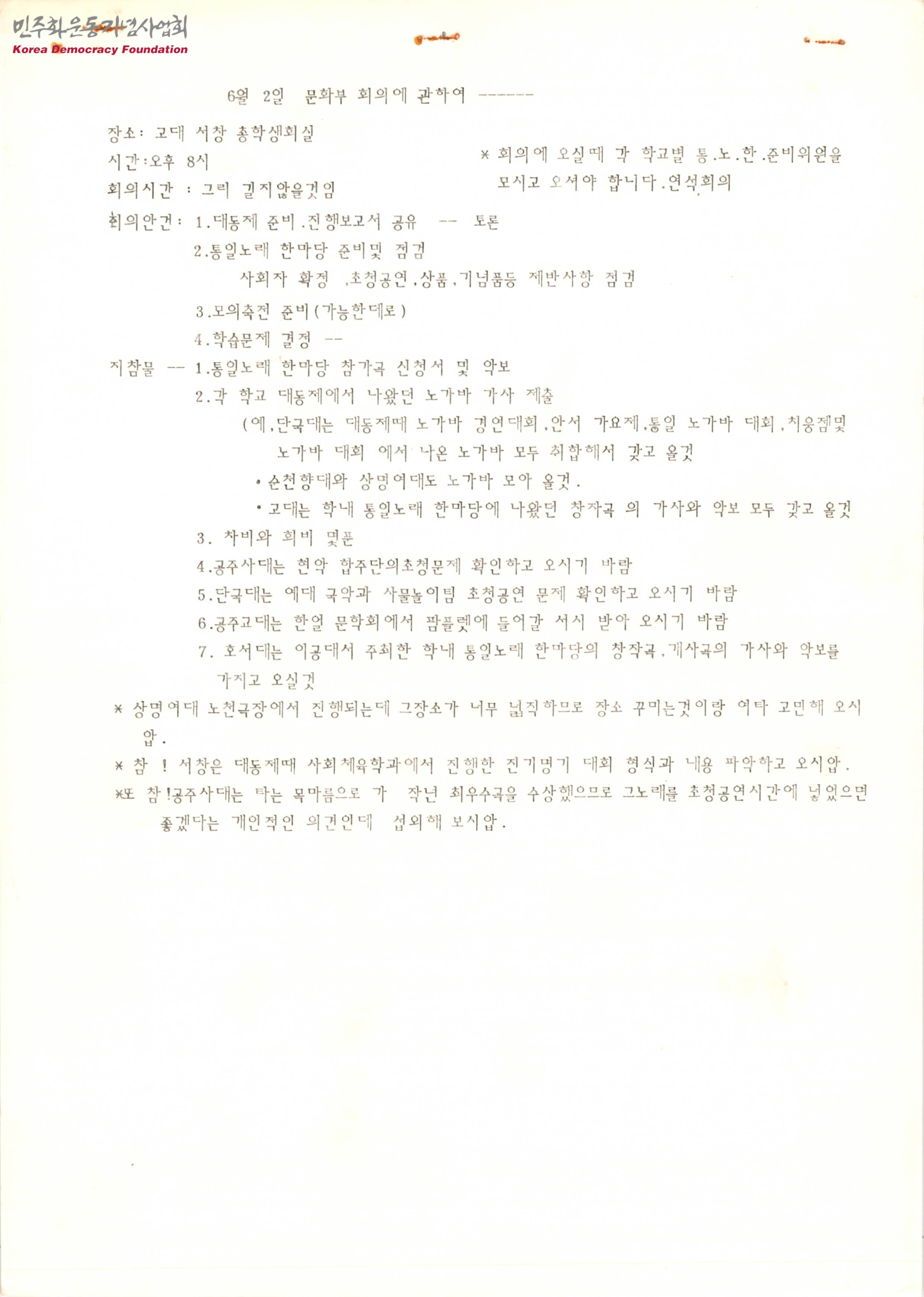 - 문화부 회의의 시간과 장소, 회의안건, 지참물 등이 적힌 문서와 천대협 문화사업을 진행하는데 있어서 사업작풍이 잘못되었다고 말하며 앞으로 진행할 행사의 성공을 위해 최선을 다해보자는 내용의 문서