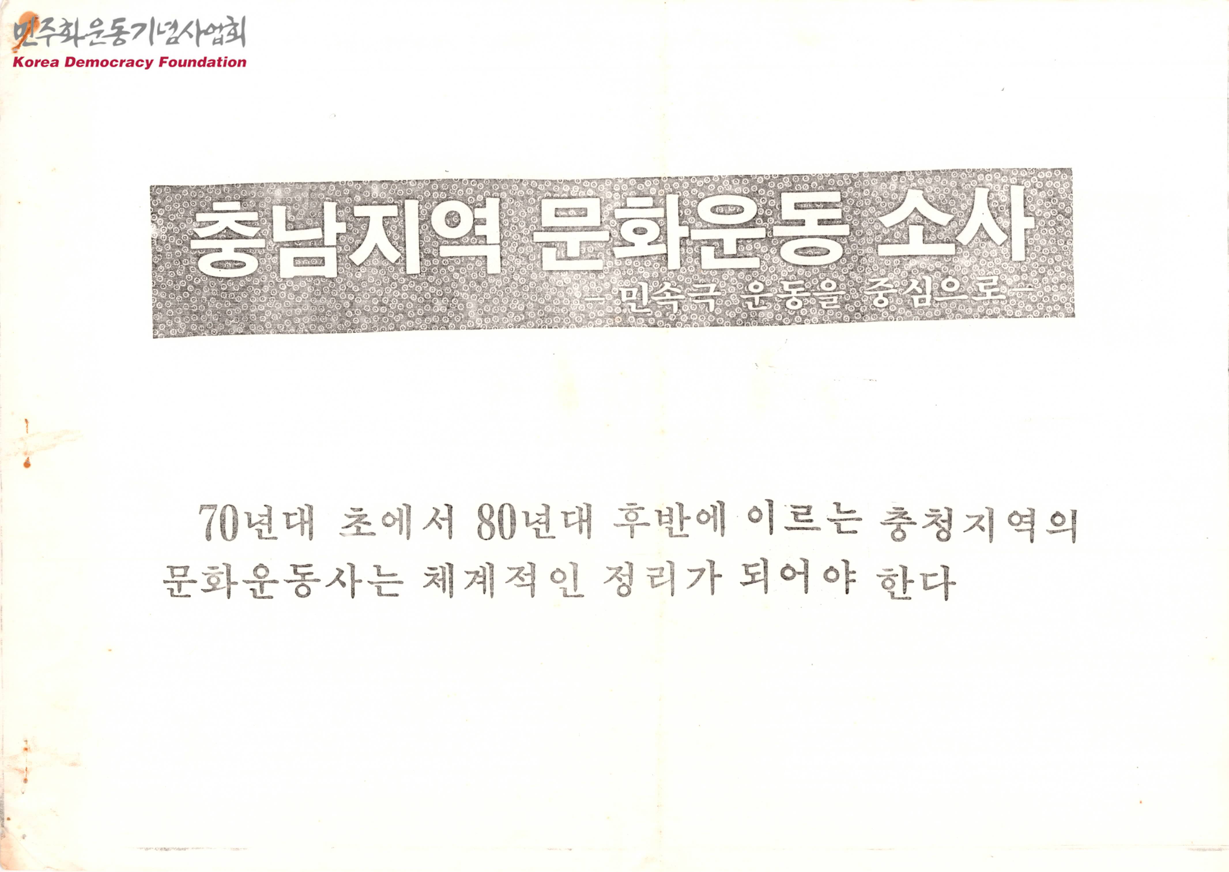 - 충남지역 문화운동 소사 - 민속극 운동을 중심으로', '민중과 노래', '민중과 놀이', '민중과 민요'가 모아져있으며, 문화운동에 대한 연구와 정리를 진행하고 있다는 공통점이 있는 문서