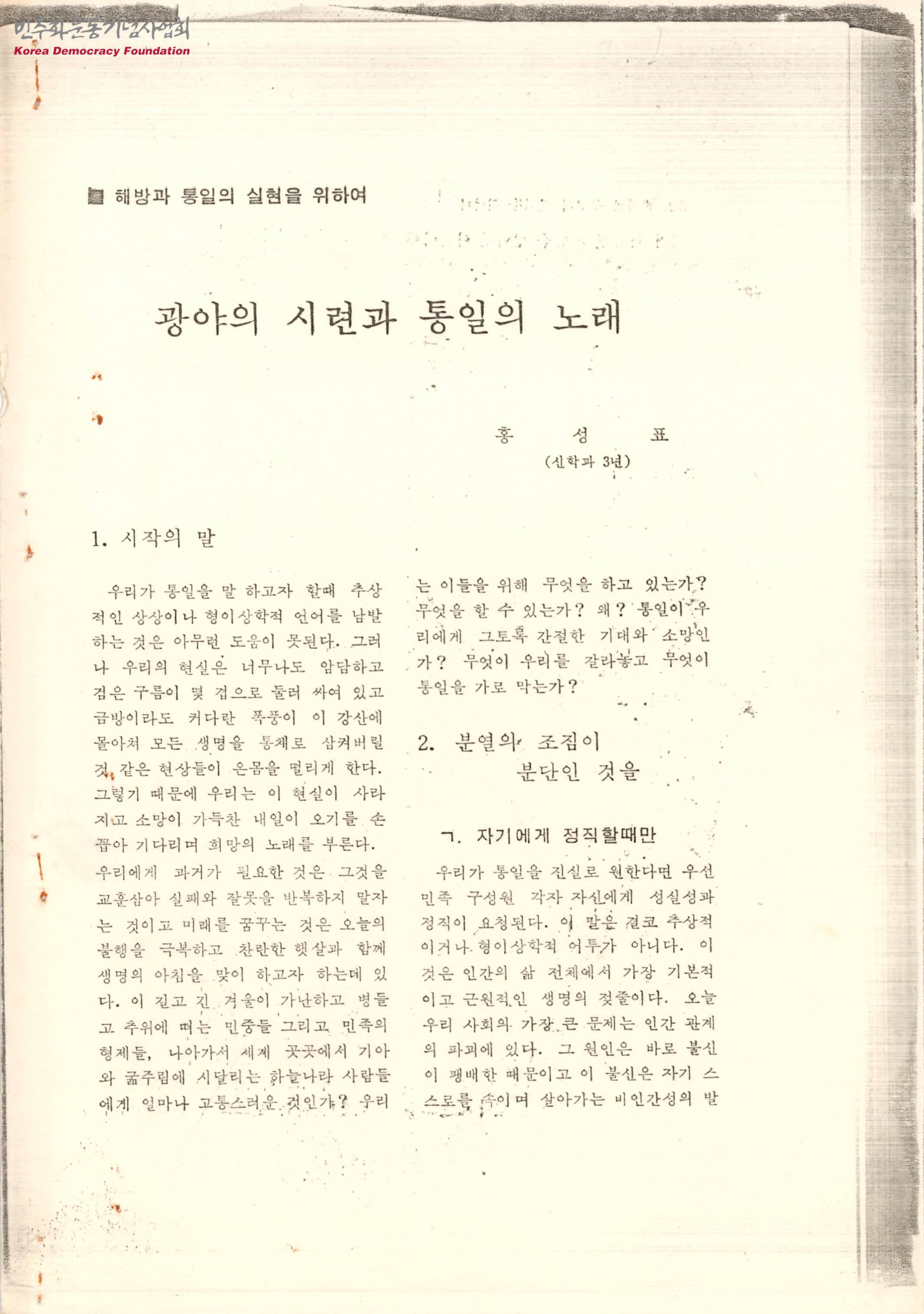 - 암담한 현실이 사라지고 소망이 가득찬 내일이 오기를 손꼽아 기다리며 희망의 노래를 부르며 통일을 기원하는 내용이 수록된 문서로 목차는 다음과 같음 1, 시작의 말 2. 분열의 조짐이 분단인 것을 3. 꿈과 역사의 단점 4. 인권이 짓밟힌다면 5. 맺음말