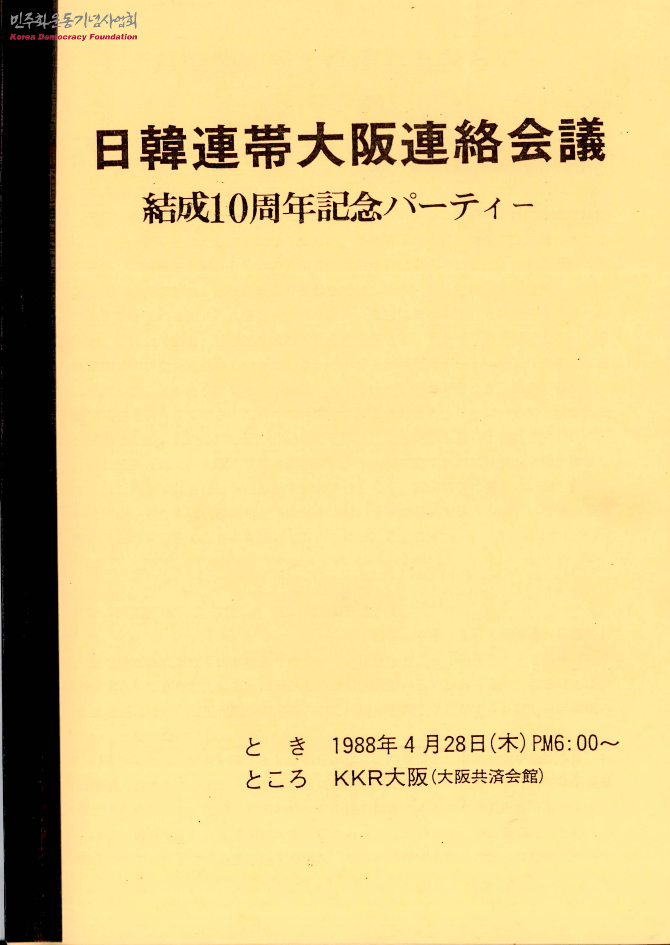 - 한국 민주화 투쟁을 일본 노동자나 대중이 진정으로 자신의 과제로 여기는 운동이 극히 빈약한 상황에서 탄생한 한일연대오사카연락회의의 10주년을 축하하며 새로운 국면을 맞이한 한국 정세에 대응할 수 있는 새로운 한일 연대 운동의 물결을 재구축한다는 내용 등이 수록된 문서