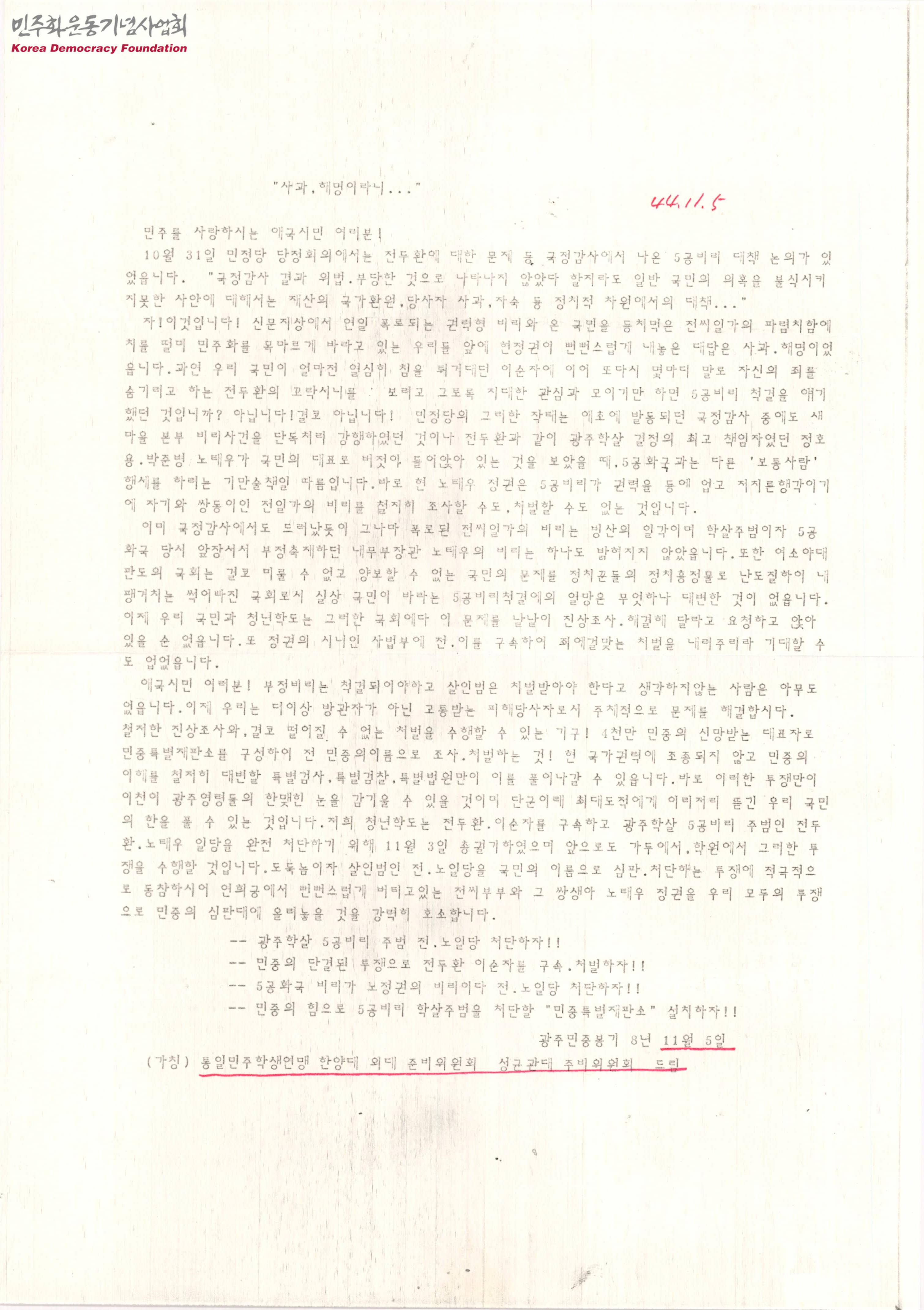 - 철저한 진상조사와 처벌을 수행할 수 있는 기구인 민중특별재판소를 구성하여 전 민중의 이름으로 관련자들을 조사하고 처벌할 것을 주장하는 내용이 수록된 문서