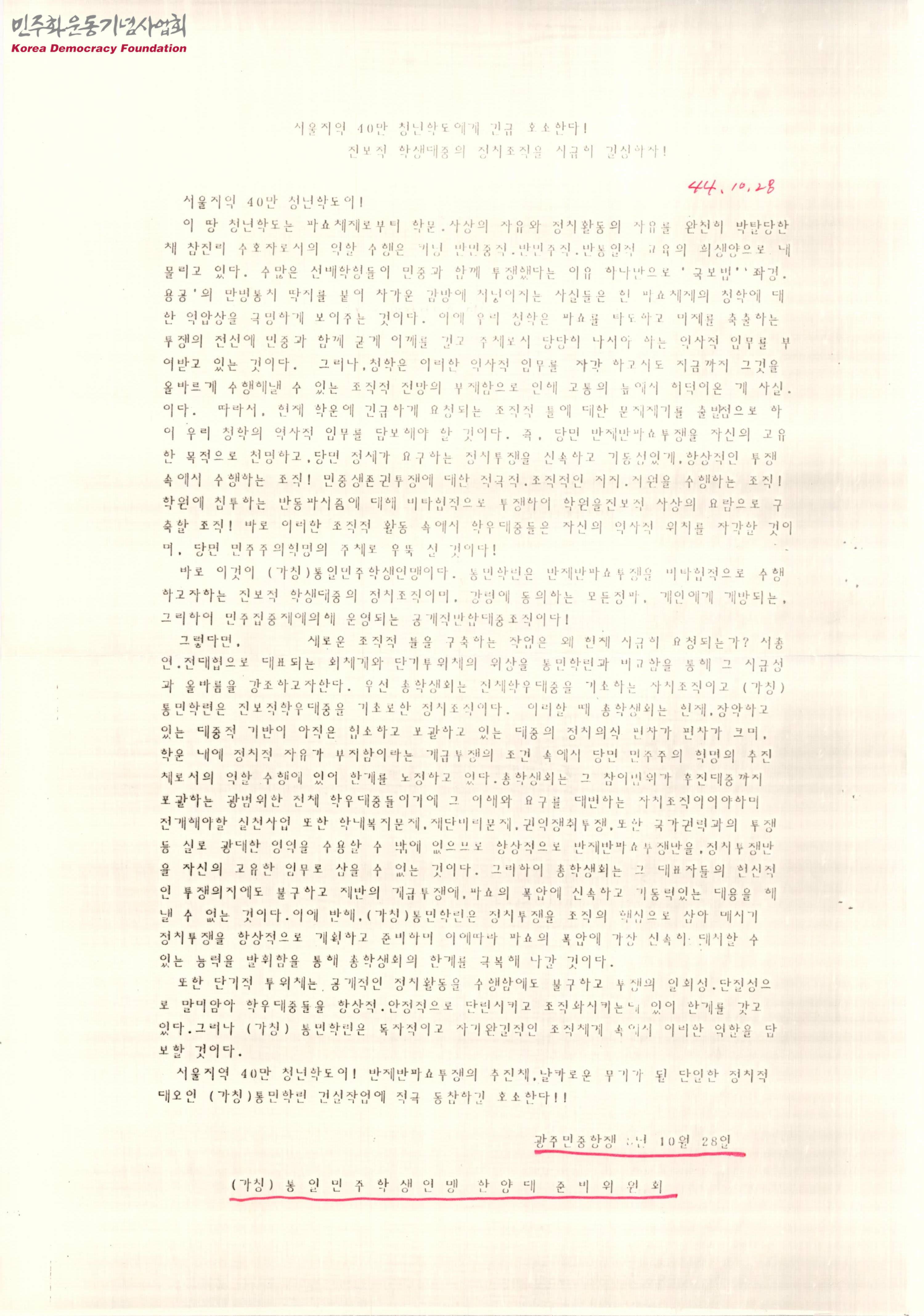 - 파쇼체제로부터 학문·사상의 자유와 정치활동의 자유를 박탈당한 청년학도의 현실, 새로운 조직적 틀을 구축하는 작업이 시급하게 요청되는 이유 등을 제시한 내용이 수록된 문서