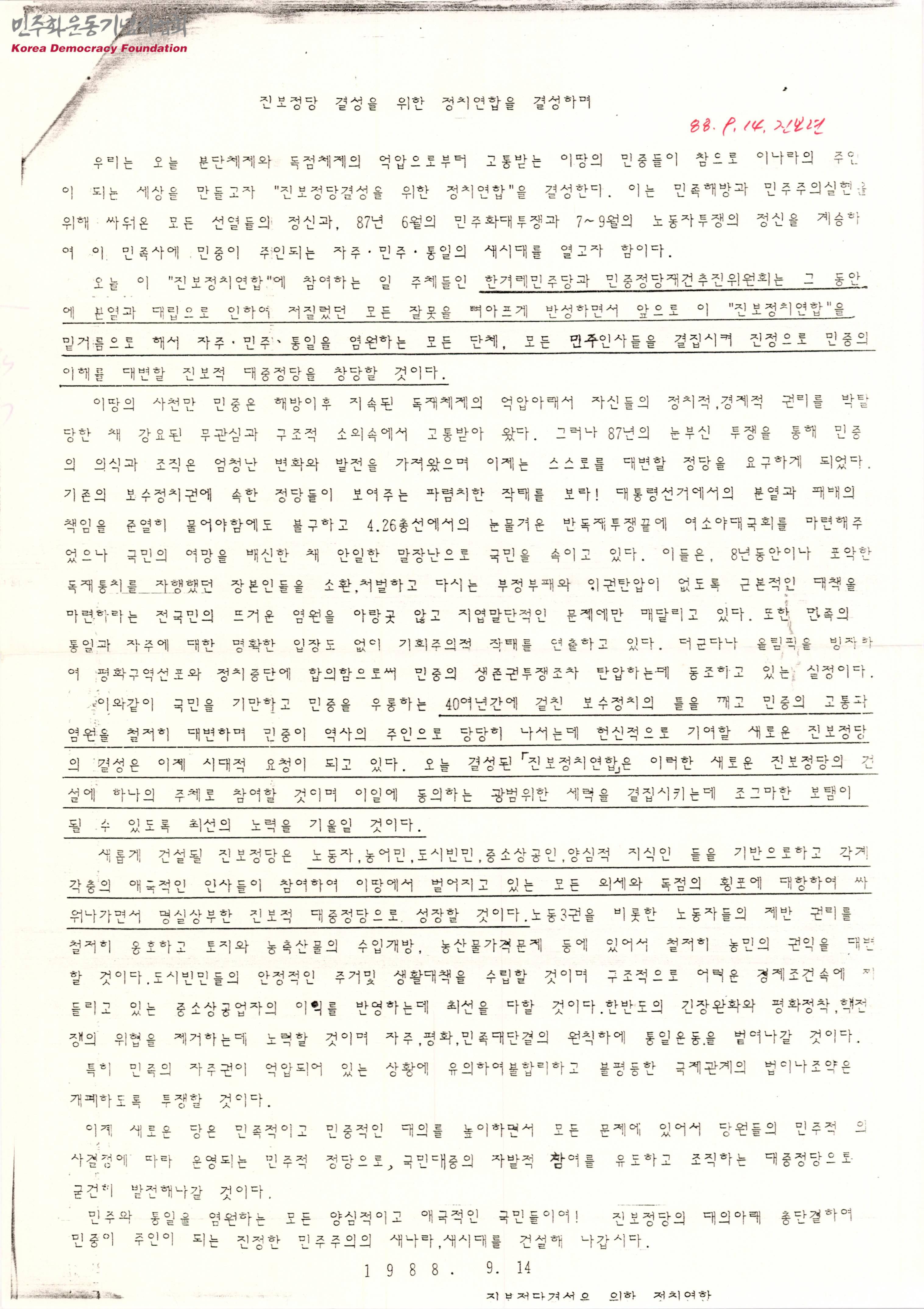 - 진보정치연합은 새로운 진보정당의 건설에 하나의 주체에 참여할것이며, 새롭게 건설될 진보정당은 이땅에서 벌어지는 외세와 독점의 횡포에 대항하면서 진보적 대중정당으로 성장할 것이라는 내용이 수록된 문서