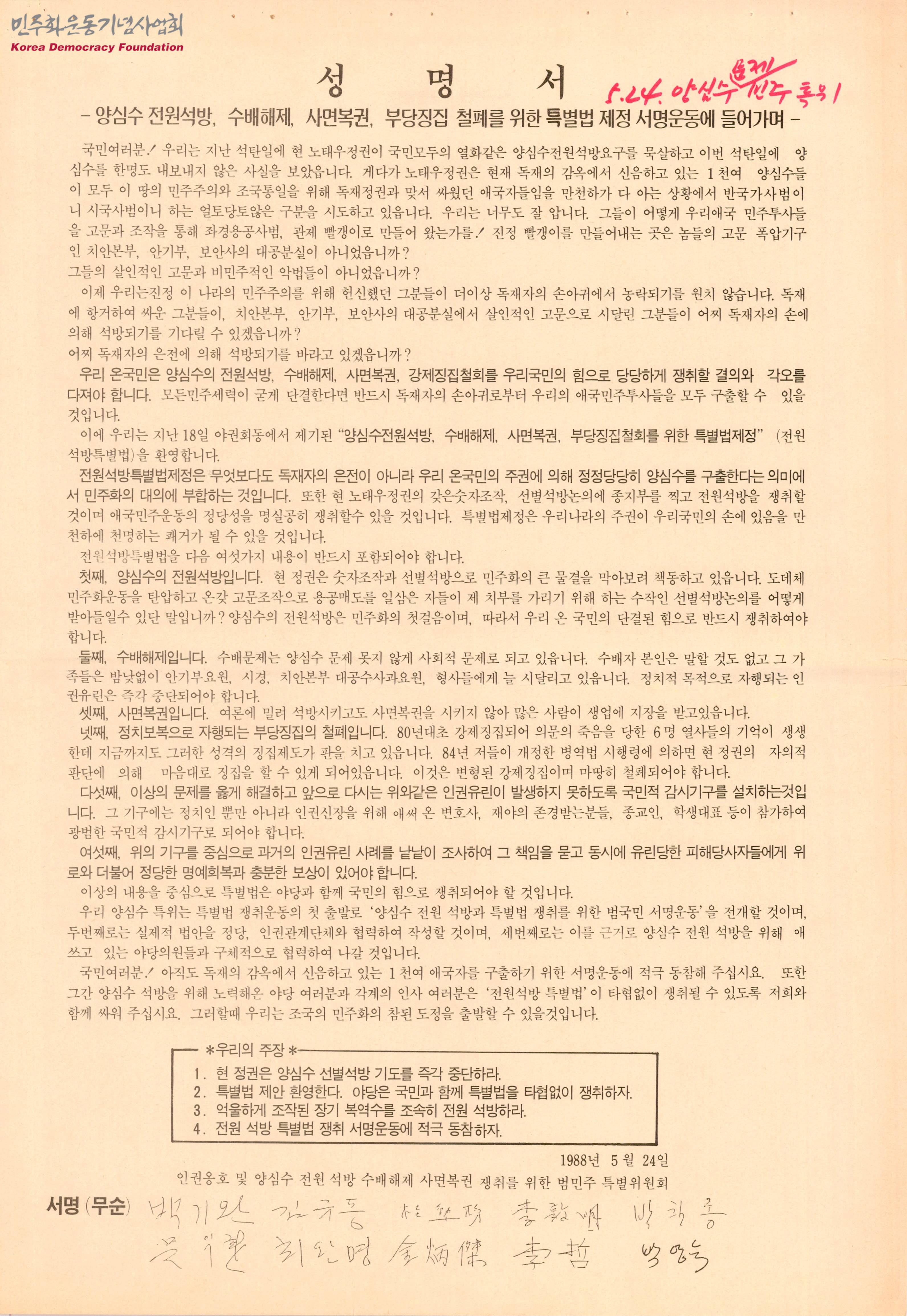 성명서-양심수 전원석방 수배해제 사면복권 부당징집 철폐를 위한 특별법 제정 서명운동에 들어가며-
