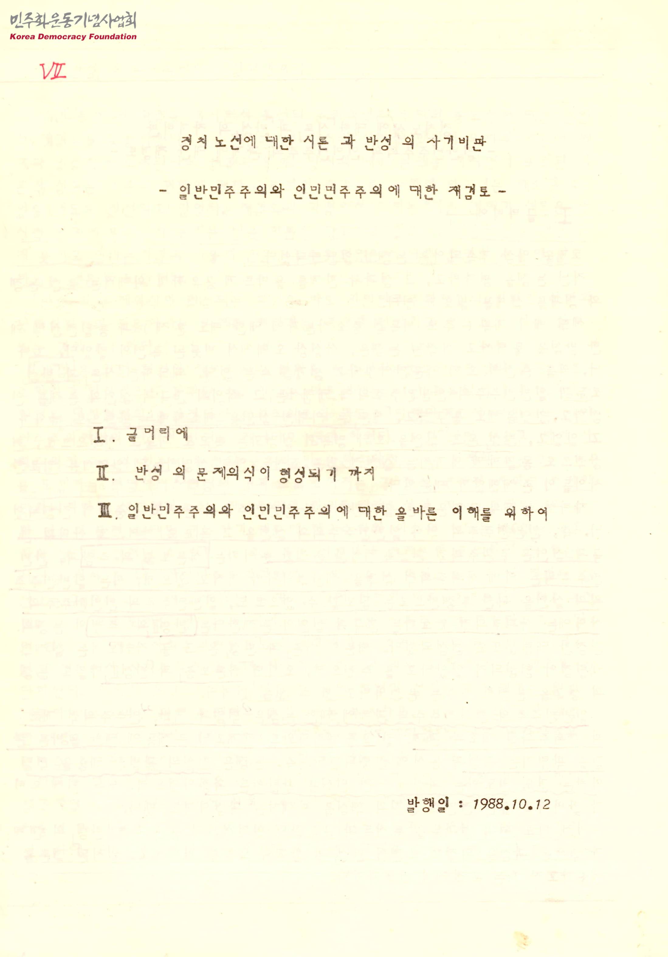 - 일반민주주의와 인민민주주의의 관계에 대해 혁명과 개량, 민주주의적 개조와 사회주의적 개조의 관계, 프롤레타리아트 헤게모니 문제 등에 대한 올바른 관점을 확립하고 현실의 광범한 대중을 혁명이라는 길로 인도하는 과정에 대한 인식을 확립하여 전면적 전환의 핵심을 파헤친 과정의 성과를 공유함으로 반성의 한계와 오류를 밝혀내고 일치된 결론을 제출하고자 작성된 문서로 목차는 다음과 같음 Ⅰ. 글머리에 Ⅱ. 반성의 문제의식이 형성되기 까지 Ⅲ. 일반민주주의와 인민민주주의에 대한 올바른 이해를 위하여