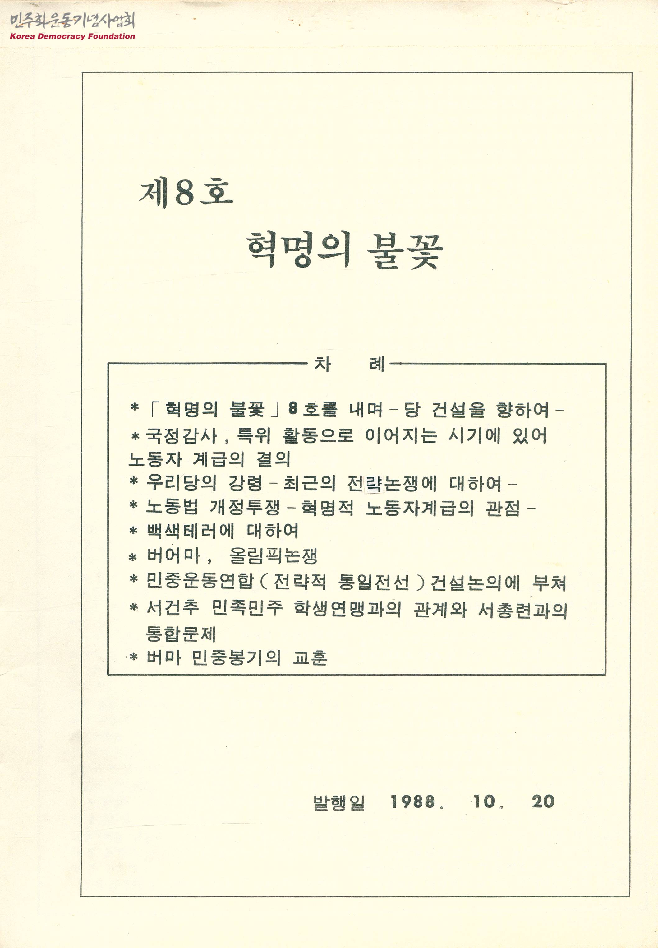 - 현 시점에서 노동자 투쟁이 나아가야 할 방향, 노동법 개정투쟁 등의 내용이 수록된 정간물로 목차는 다음과 같음 -「혁명의 불꽃」8호를 내며-당 건설을 향하여- -국정감사, 특위 활동으로 이어지는 시기에 있어 노동자 계급의 결의 -우리당의 강령-최근의 전략논쟁에 대하여- -노동법 개정투쟁-혁명적 노동자계급의 관점- -백색테러에 대하여 -버어마, 올림픽논쟁 -민중운동연합(전략적 통일전선) 건설논의에 부쳐 -서건추 민족민주학생연맹과의 관계와 서총련과의 통합문제 -버마 민중봉기의 교훈