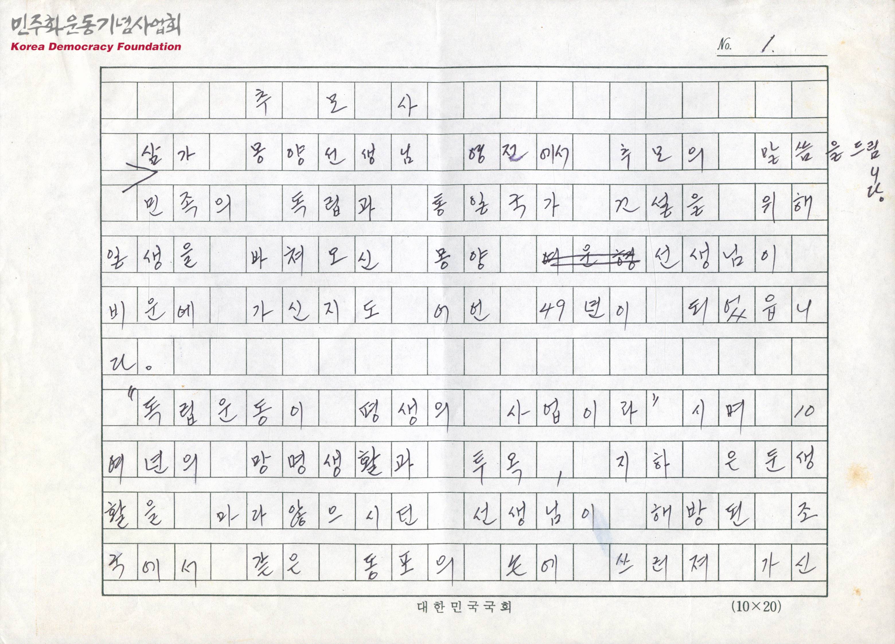 - 조국의 독립과 통일정부 수립을 위해 노력하신 여운형선생의 49주기를 맞아 여운형 선생을 추모하고 한반도에 남아있는 냉전의 잔재, 여성의 권리문제를 해결하겠다고 다짐한 내용이 수록된 문서