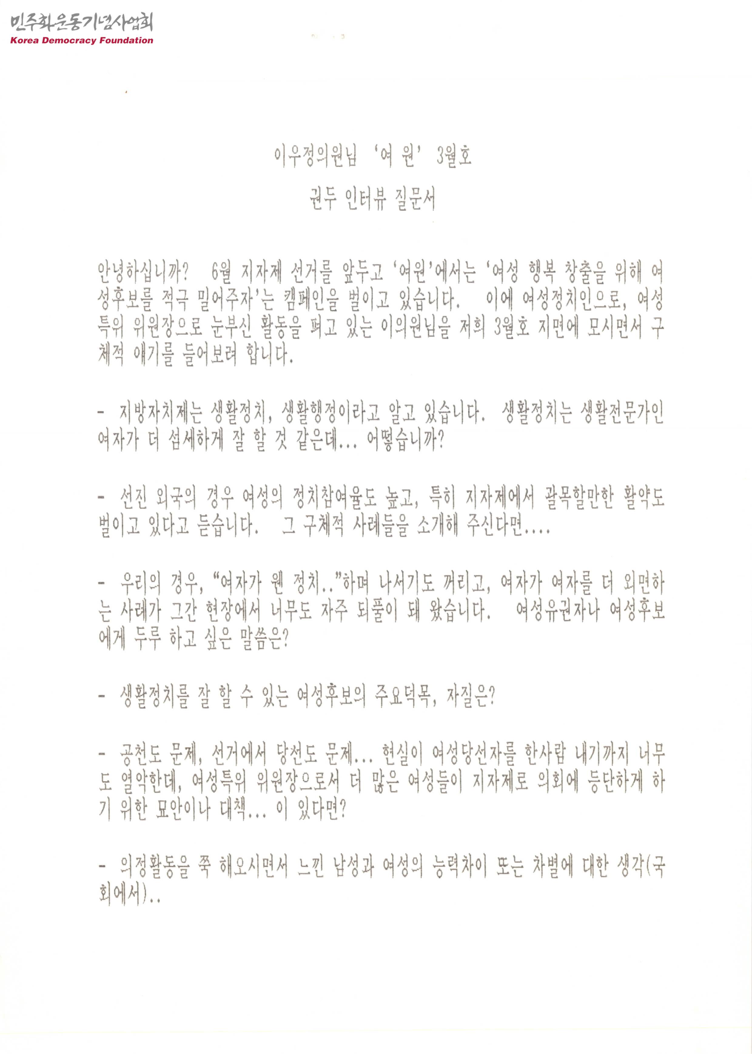 이우정의원님 '여원' 3월호 권두 인터뷰 질문서