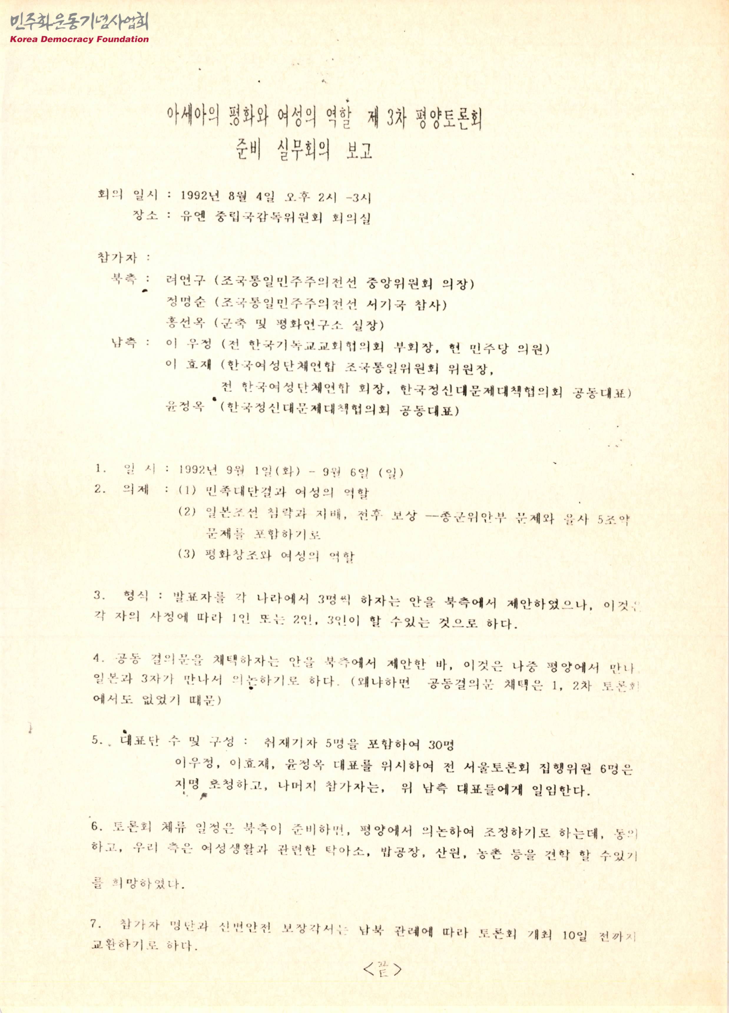 아세아의 평화와 여성의 역할 제3차 평양토론회 준비 실무회의 보고