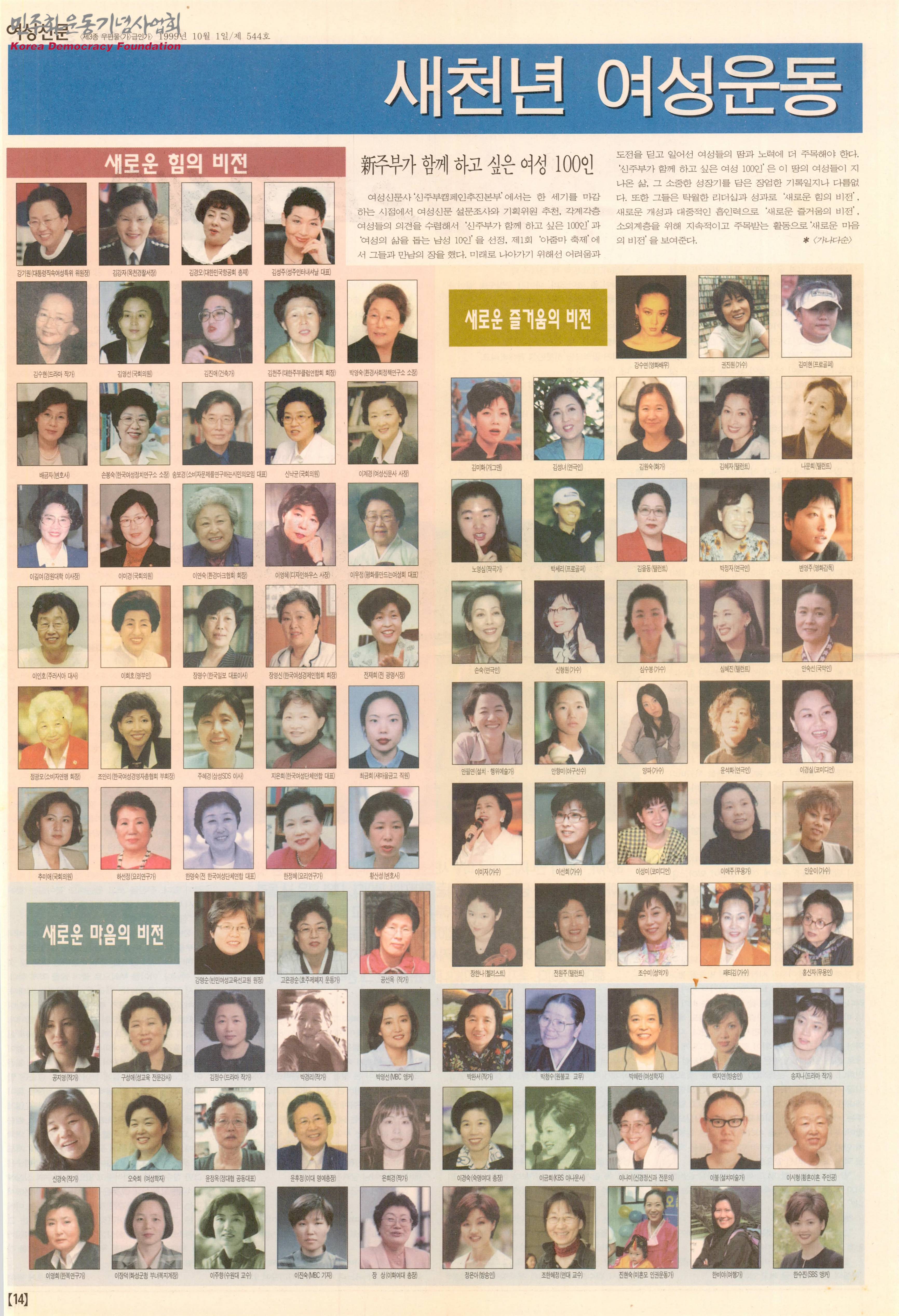 - 여성신문사 '신주부캠페인추진본부'에서는 한 세기를 마감하는 시점에서 여성신문 설문조사와 기획위원 추천, 각계각층 여성들의 의견을 수렴하여 '신주부가 함께 하고 싶은 100'인을 선정 그들과 만나는 자리를 마련하였다는 내용이 수록된 신문스크랩