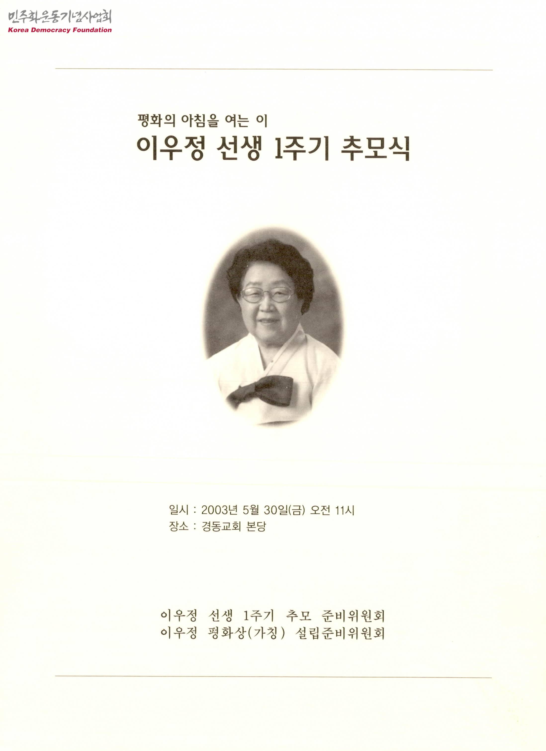 평화의 아침을 여는 이 이우정 선생 1주기 추모식