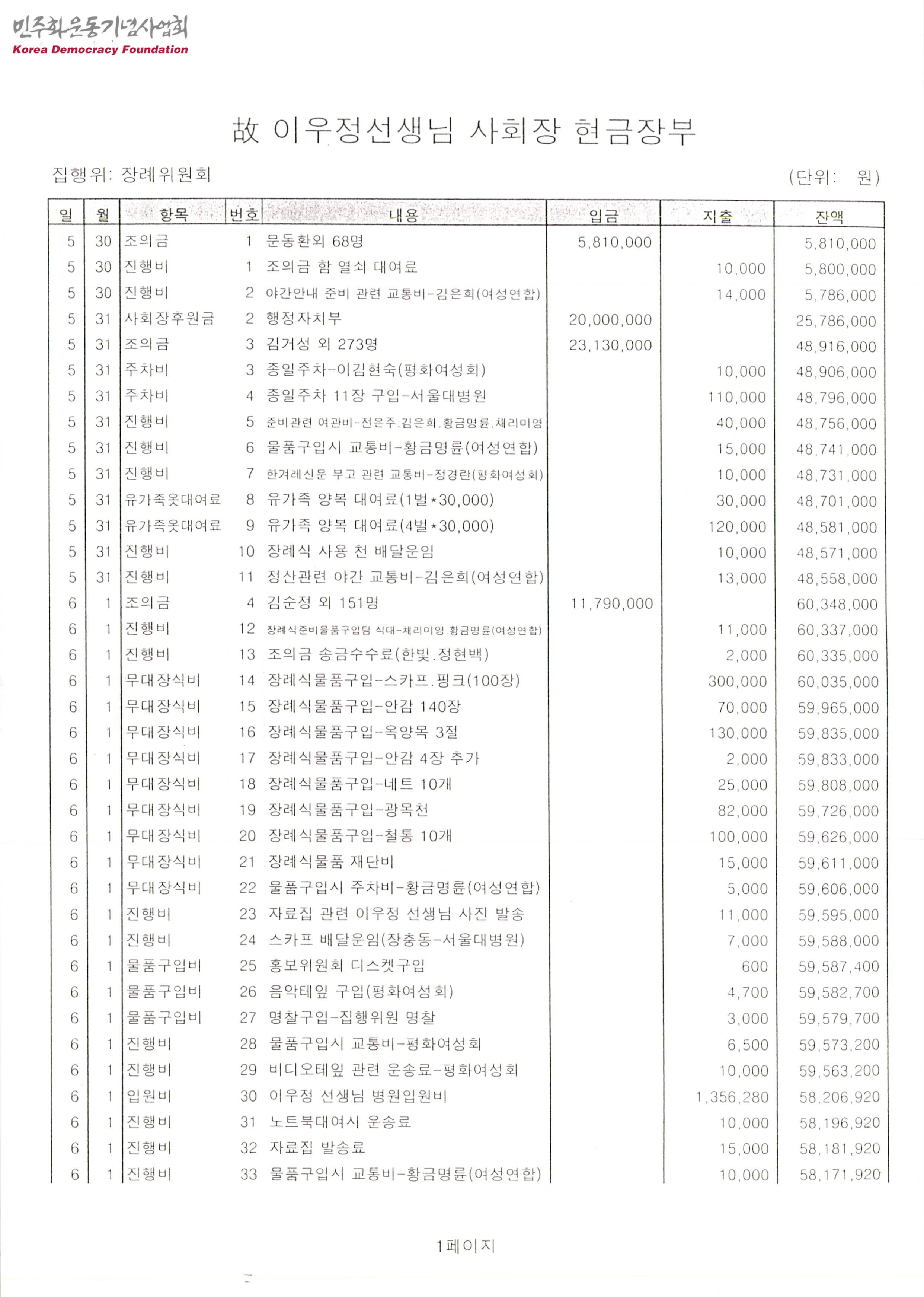 故 이우정 선생님 사회장 현금장부