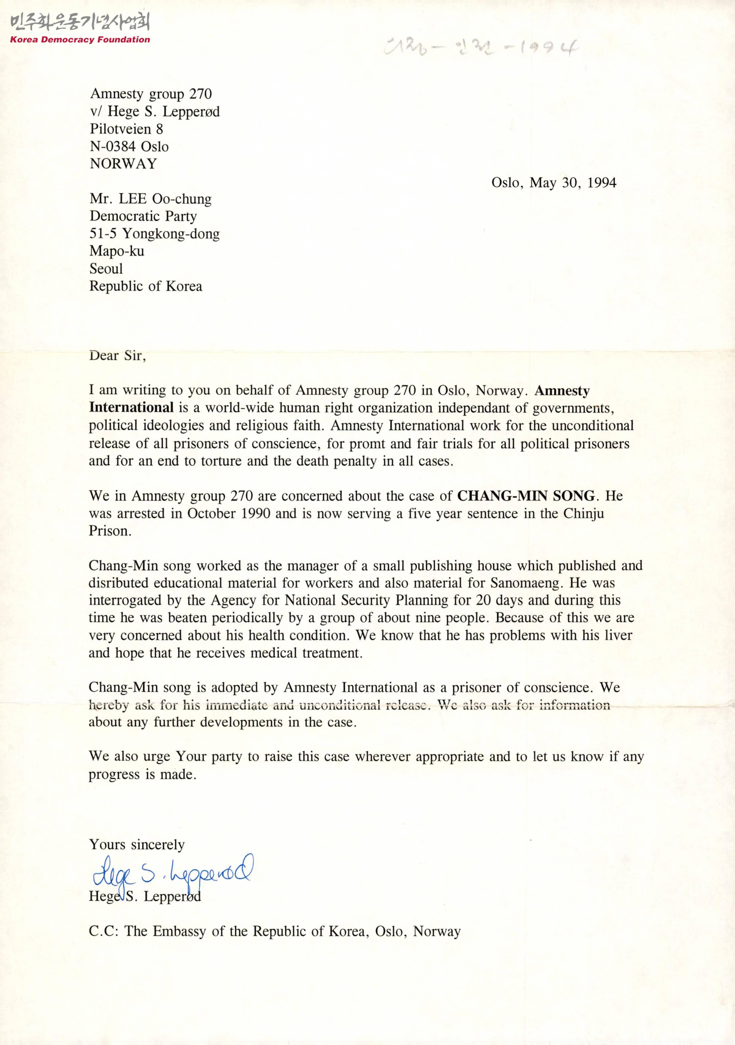 [Hege. S. Lepperod가 양심수 송창민에 관련해 이우정에게 쓴 서신]