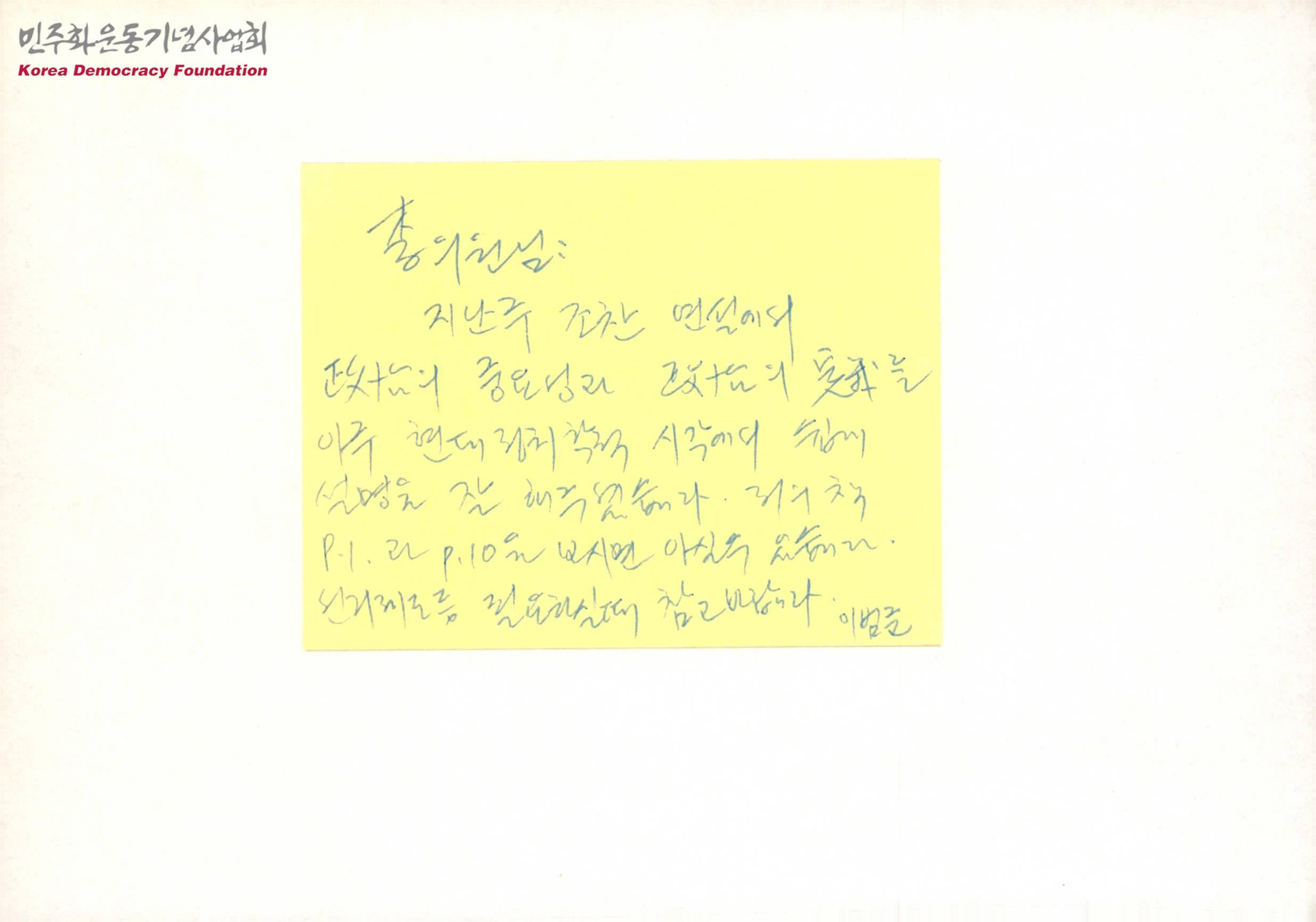 - 이우정이 지난 조찬연설에서 정치의 중요성에 관한 내용을 현대 정치학적 시각에서 잘 설명해 주었다는 것과 선거제도 사항에 대한 내용이 필요할때 자신의 책을 참고하라는 내용의 서신