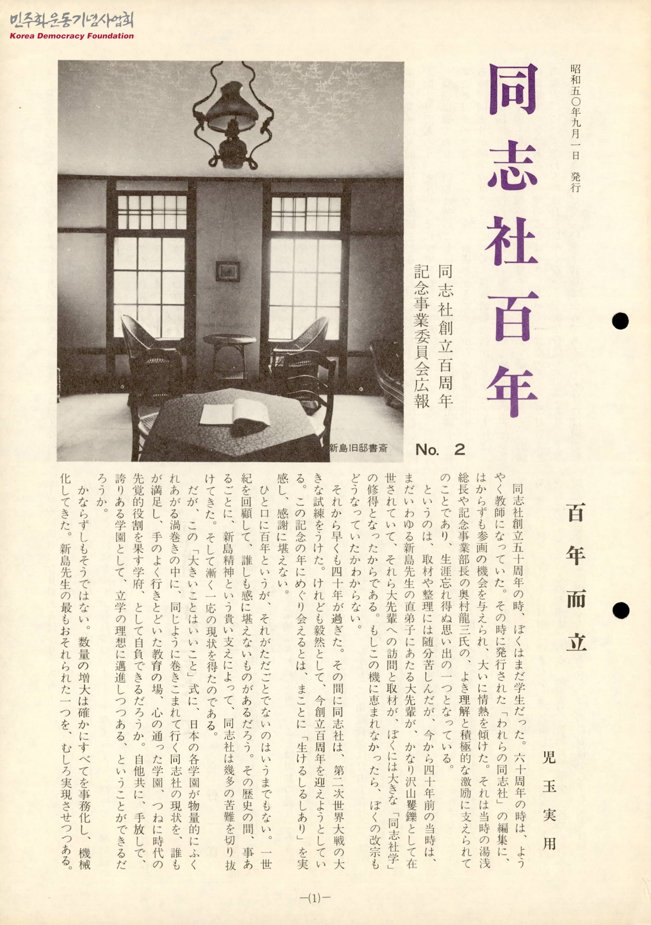 - 도시샤 창립 백년을 맞은게 경사스럽다는 글, 도시샤 창립 100주년 기념 사업 계획, 위원회 심의 경과보고, 명예고문의 의뢰 행각 활동보고 등의 내용이 수록된 정간물