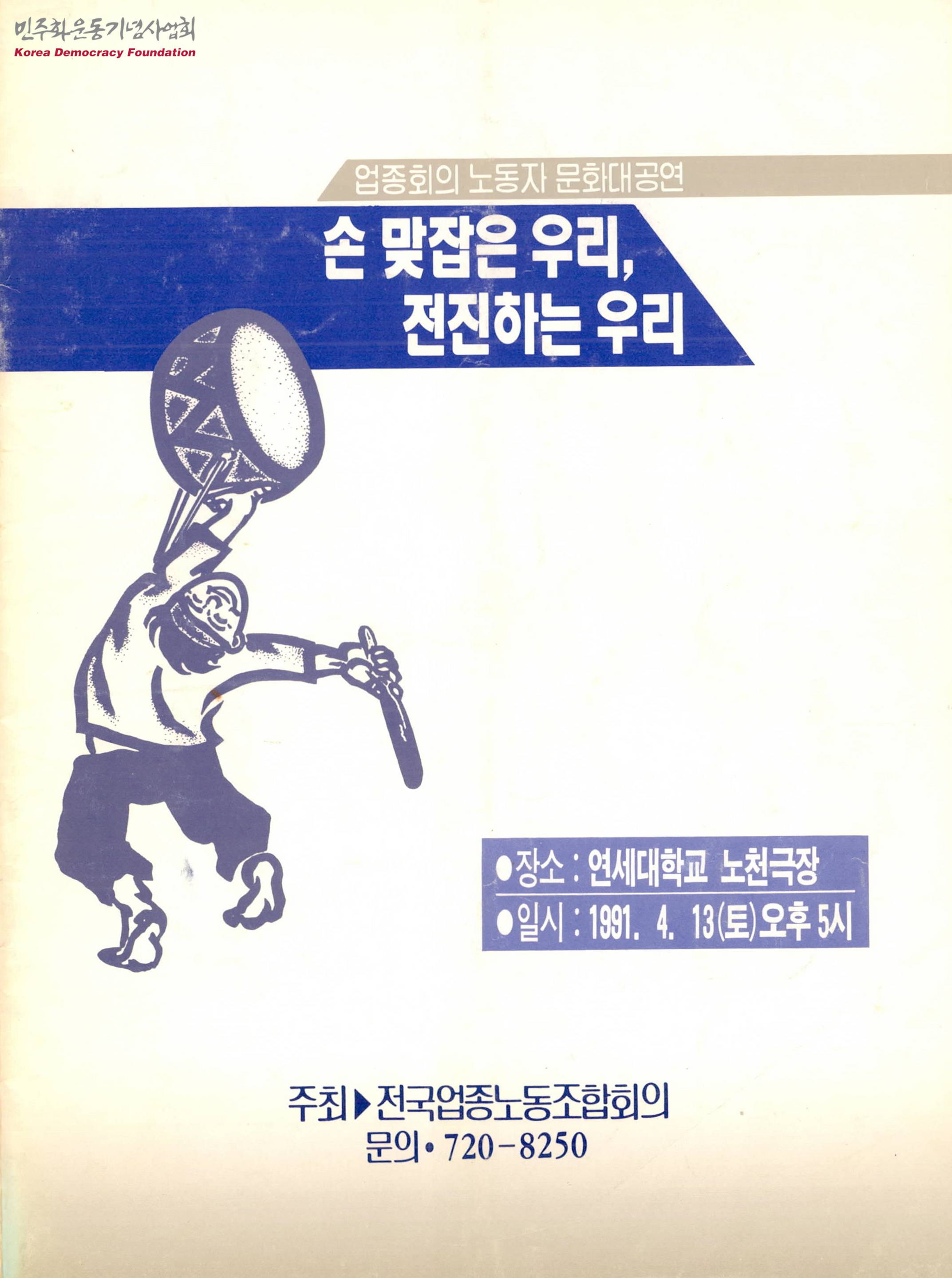 - 전국업종노동조합회의의 발족 이후 처음으로 여는 문화제 큰 잔치로, 사무·전문기술직 노동자들의 결집체인 업종회의 소속 연맹·협의회의 노래패, 풍물패를 중심으로 펼쳐지는 종합적인 문화놀이판 한마당의 안내문으로 주요 목차는 다음과 같음 -출연진 소개 -다시 또다시 -들어나 봤나 -메이데이의 노래 -조개와 노동자 -철의 노동자 -해방을 향한 진군 -민중권력 쟁취가