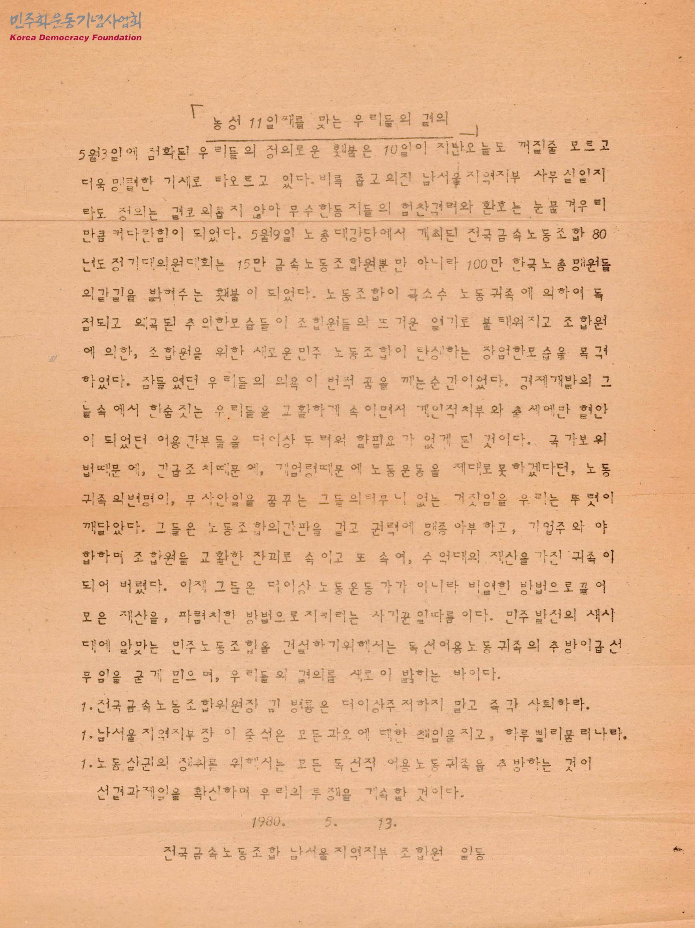 - 노동조합의 간부자리에서 기업주에 야합하고, 자신들의 이익만을 챙기는 '어용노동귀족'들에 대해 비판하며, 현 금속노조위원장인 김병룡과 남서울지역지부장 이중석의 사퇴를 요구하고, 노동삼권 쟁취를 위해 모든 독선적 어용노동귀족을 추방할 것임을 밝히는 내용의 결의문