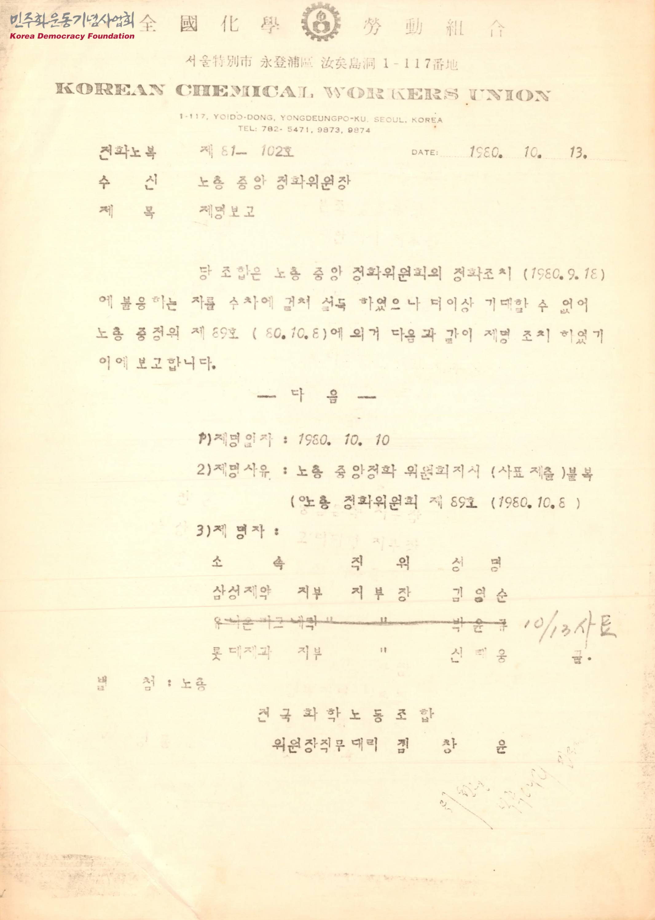 - 노총 중앙 정화위원회의 정화조치에 불응한 김영순과 신태웅에 대해 제명 조치를 진행했음을 알리는 보고서로 화학노조의 간부 명단과 정화 대상자에 대한 조치 사항이 담긴 문서가 첨부되어 있음