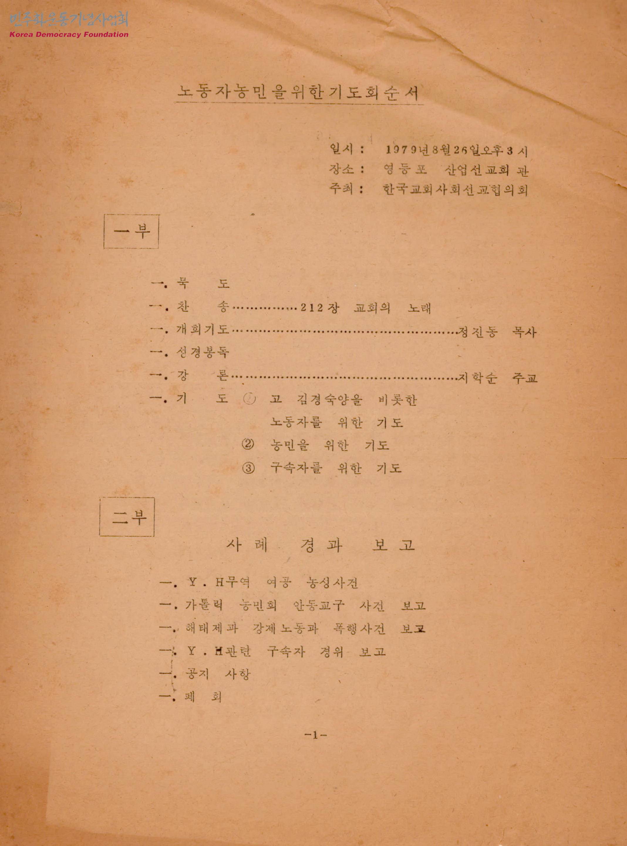 - 기도회의 순서와 찬송가, 농민·노동자 투쟁 관련 노래의 가사가 실려 있는 문서
