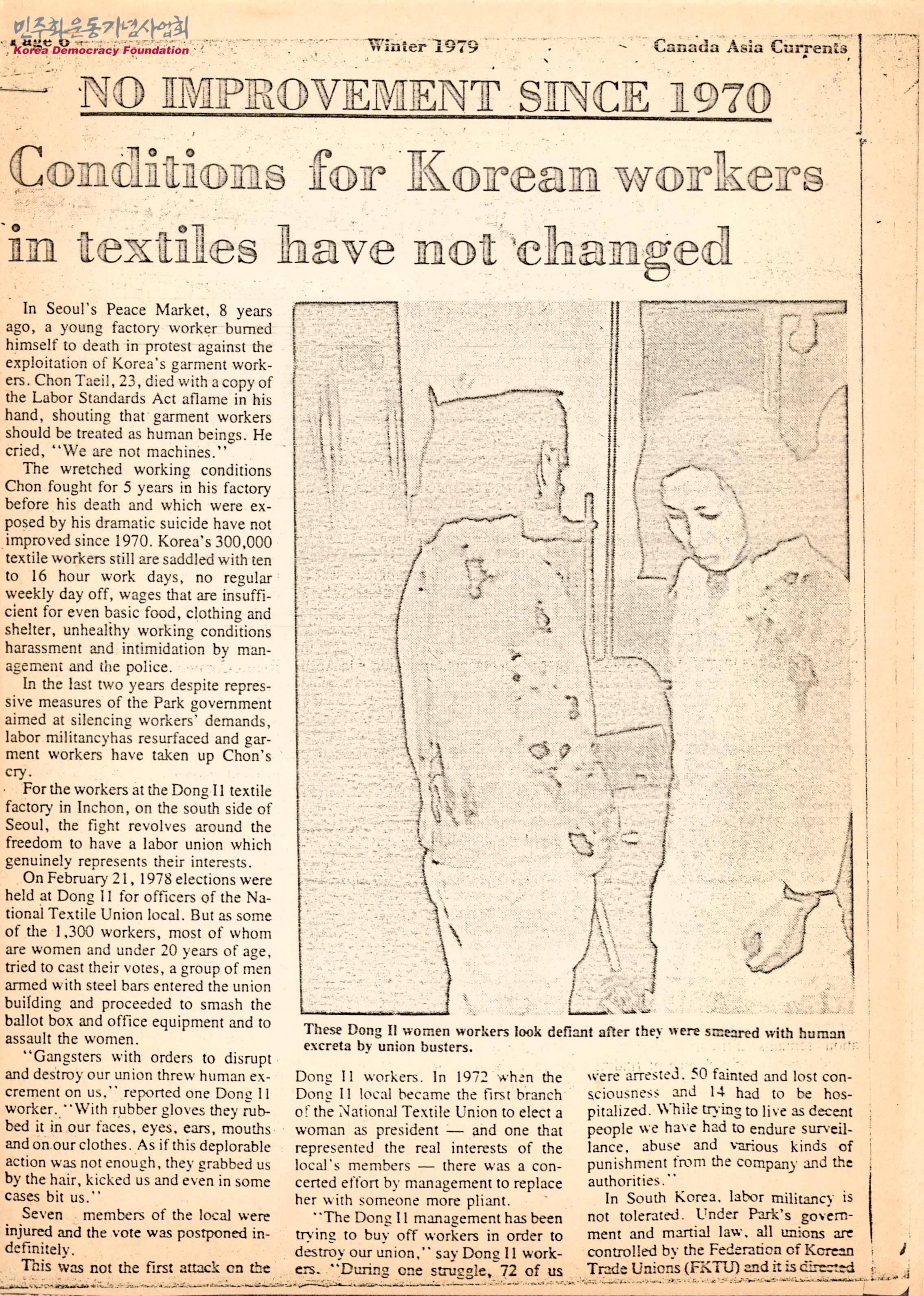 - 전태일이 의류노동자들을 착취하는 것에 항의하며 분신한 사건이 있었음에도 불구하고 비참한 노동조건은 나아지지 않았고, 동일방직에서 전국방직노조 간부 선거가 열리자 철봉으로 무장한 남성들이 노조 건물로 들어와 투표함과 사무기기를 부수고 여성들을 폭행했다는 것, 노조를 와해시키라는 명령을 받은 조직폭력배들이 조합원들에게 배설물을 던지고 폭행했다는 것 등 동일방직에서 일어난 노동자 탄압에 대한 내용이 적힌 신문스크랩