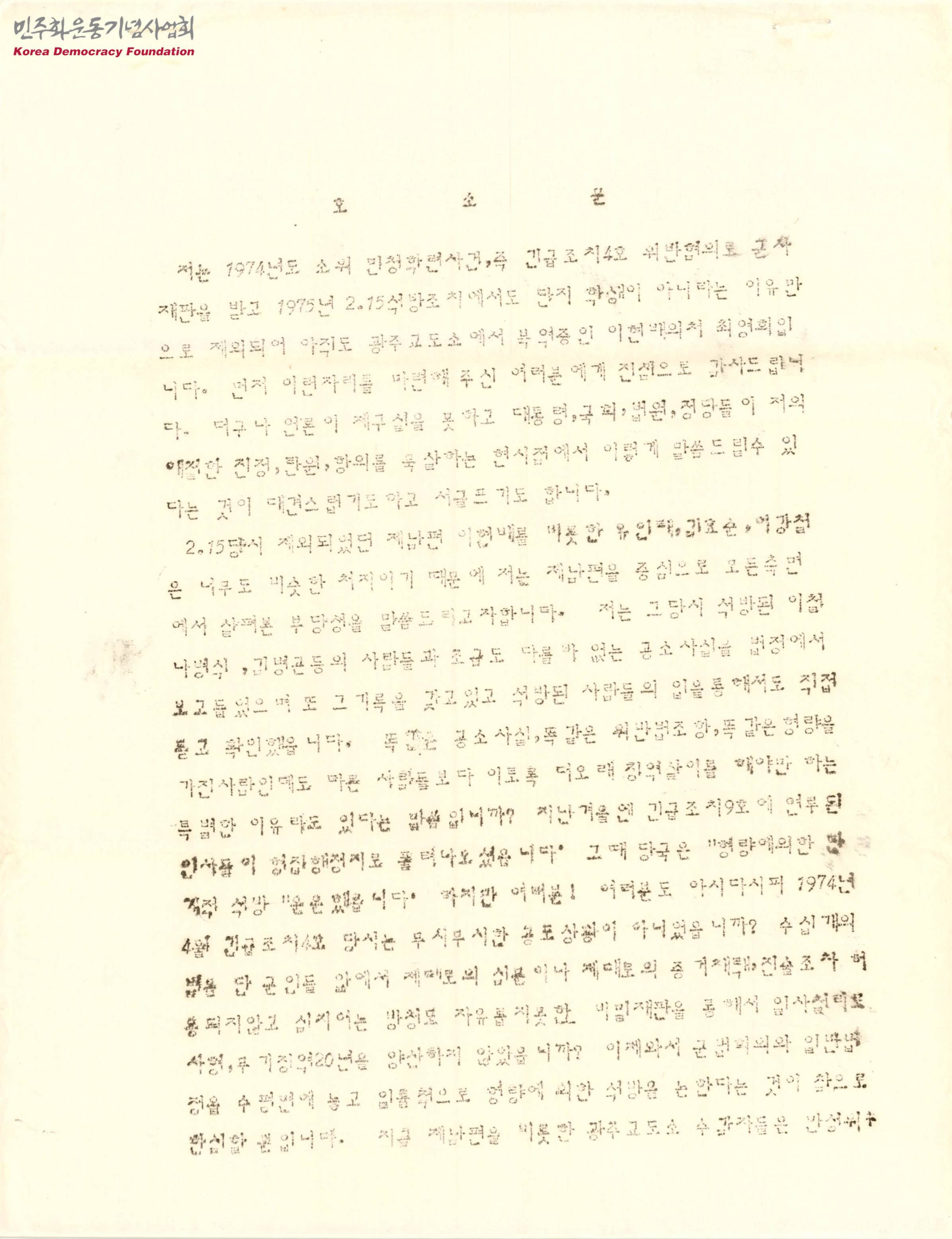 - 민청학련 사건 즉 긴급조치 4호 위반혐의로 군사재판을 받고 2.15 석방조치에서도 학생이 아니라는 이유만으로 제외되어 아직 광주 교도소에서 복역중인 이현배는 똑같은 공소사실을 가진 사람들은 석방되었지만 더 오래 징역살이를 하고 있다고 말하며 4년 동안 겪은 부당함과 억울함을 밝히고 남편을 비롯한 정치적 수감자들의 무조건 석방과 국민의 성원을 기대한다는 내용의 문서