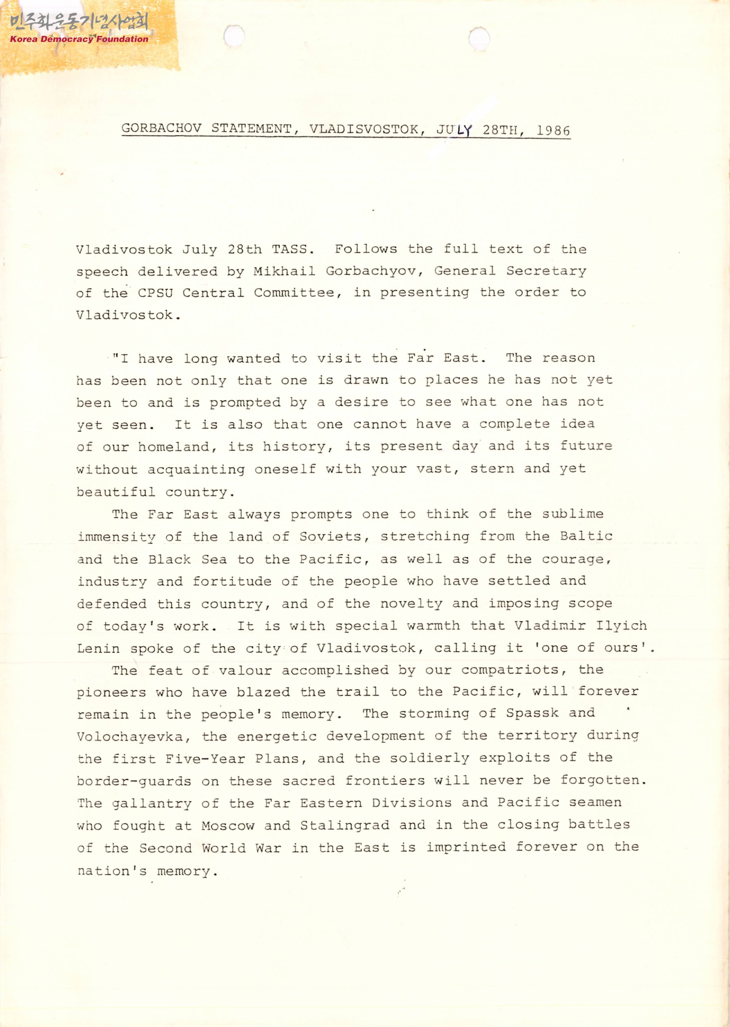 GORBACHOV STATEMENT, VLADISVOSTOK, JULY 28TH, 1986(1986년 7월 28일 블라디보스토크의 고르바초프 성명서)