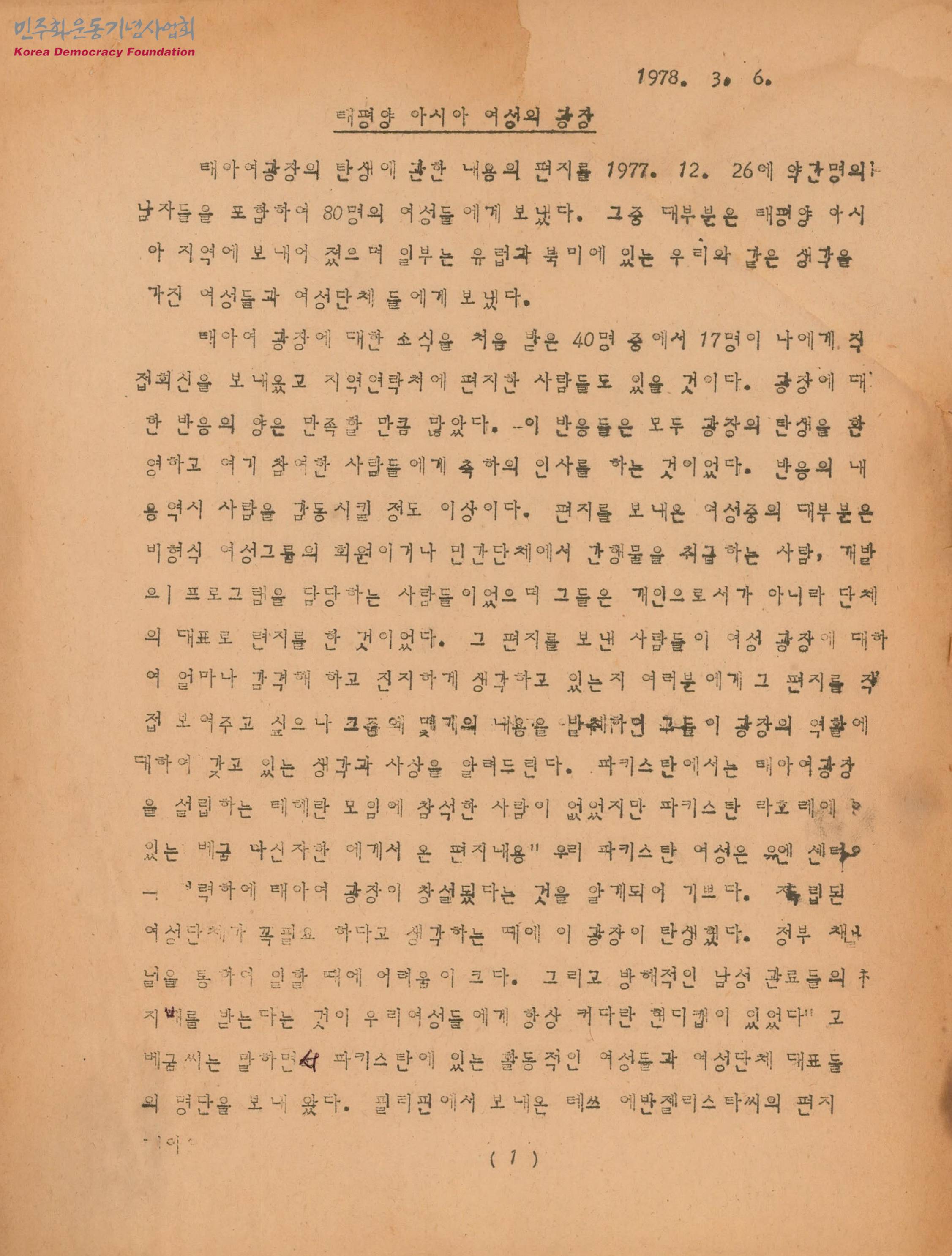 - 태평양아시아 여성의 광장 탄생에 관한 내용의 편지를 80명의 여성에게 보냈고 이들이 광장의 탄생과 여성광장에 대해 감격해하고 진지하게 생각하는지 알 수 있는 내용의 회신을 받았다 말하며 회신 내용의 소개, 태평양아시아 여성의 광장이 해야할 일, 다른 대륙으로부터의 지원 내용 등이 적힌 문서