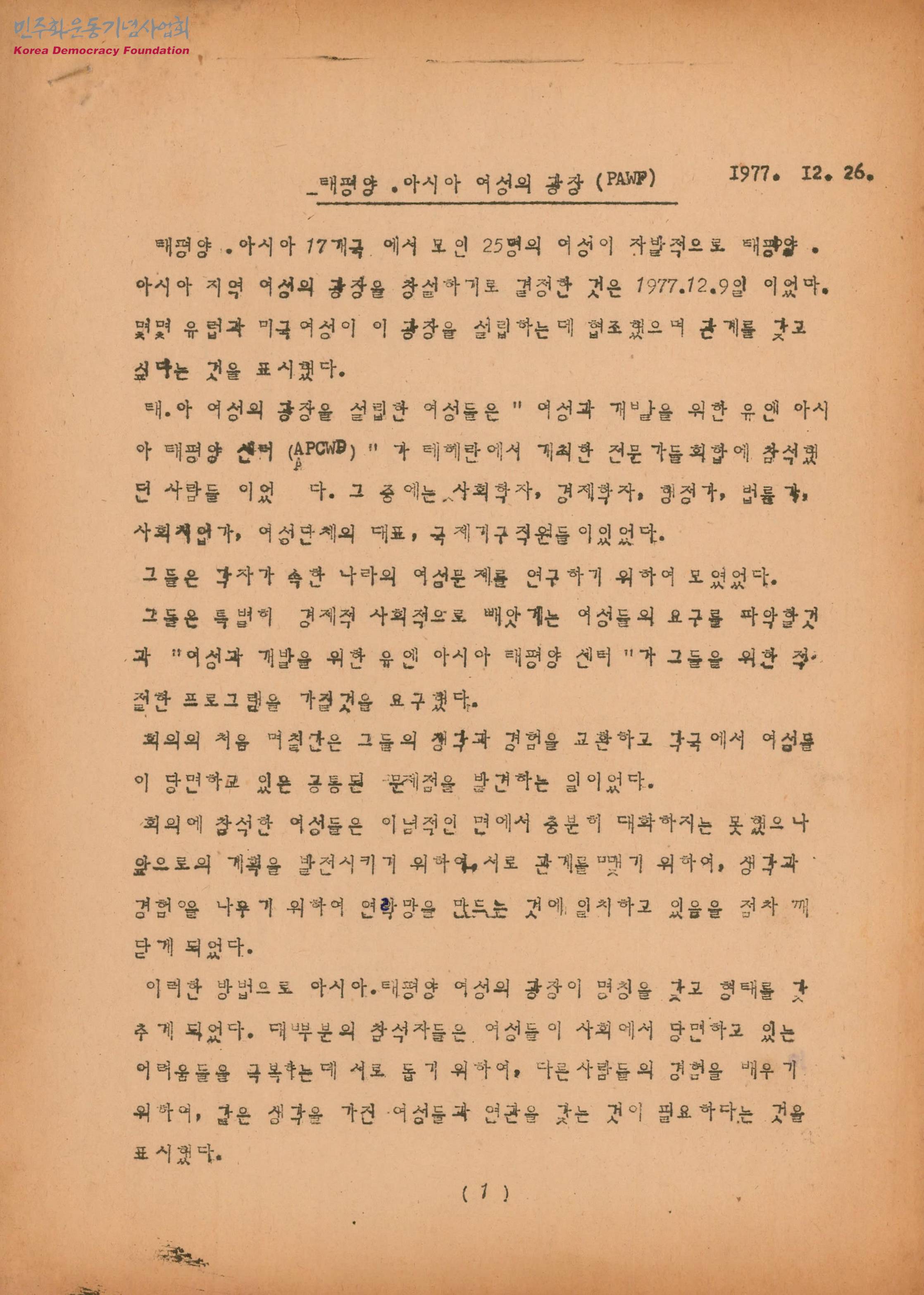 - 각자가 속한 나라의 여성문제를 연구하기 위해 모인 여성들이 각국에서 여성들이 당면한 공동된 문제점을 발견하고 앞으로의 계획을 발전시키기 위한 연락망을 만드는 것에 생각을 일치시켜 태평양아시아 여성의 광장이 만들어지게 되었다고 말하며, 광장 창설의 과정을 수록한 문서