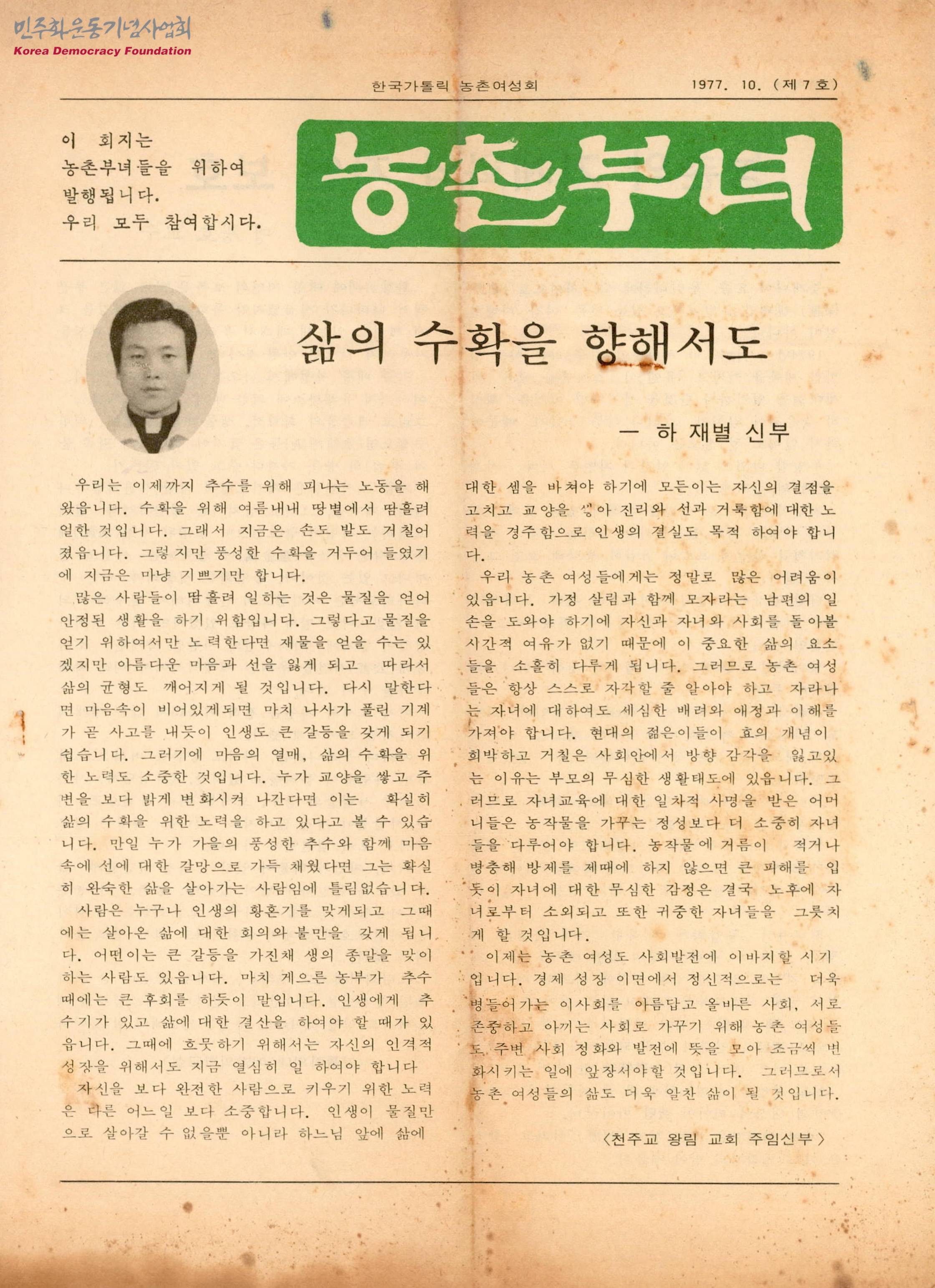 - 농촌의 기계화로 인한 환경 변화에 대한 내용, 농촌 공소 성모회 활동 내용, 농촌여성이 직면한 문제점 등의 내용이 적힌 정간물로 수록된 글은 다음과 같음 -삶의 수확을 향해서도 -농촌의 기계화와 자연 보호 -협동활동 -서독 가톨릭 농촌여성 활동 -연령들에게 안식을 -농가수입과 자녀교육비 -「화산농원」의 개척자 -감이 익을 무렵 -부녀소식
