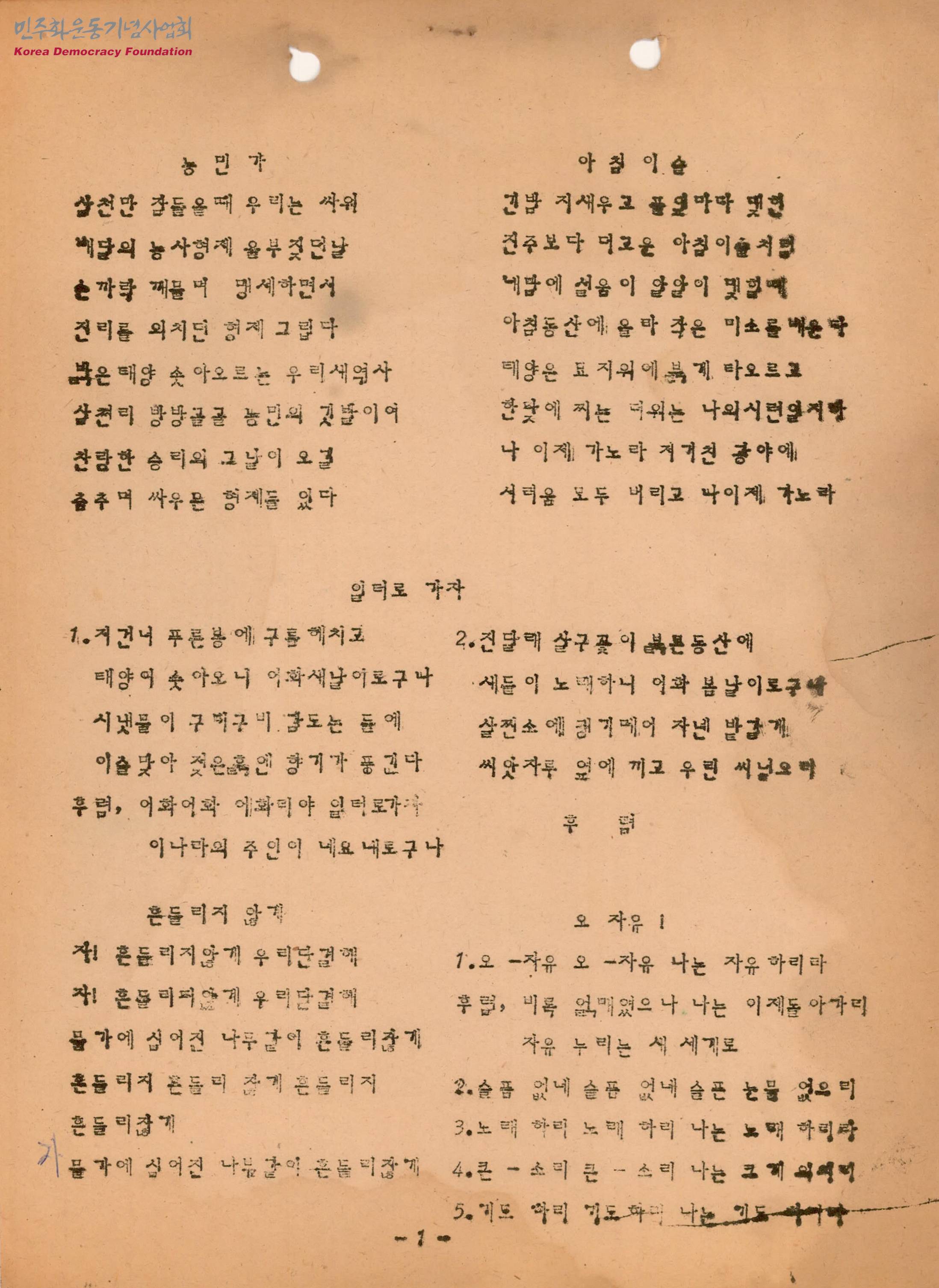 - 농촌 여성들을 위한 노래의 가사가 수록된 문서로 수록된 노래는 다음과 같음 -농민가 -아침이슬 -일터로 가자 -흔들리지 않게 -오 자유! -어찌갈까나 -가요, 나는 가요 -허재비 -갑돌이와 갑순이 -정든 그 노래 -꽃동네 새동네 -보람된 생활 -혼자로는 -선구자 -우리 승리하리라 -진주낭봉가 -동금포타령 -농민의 노래 -한걸음 더