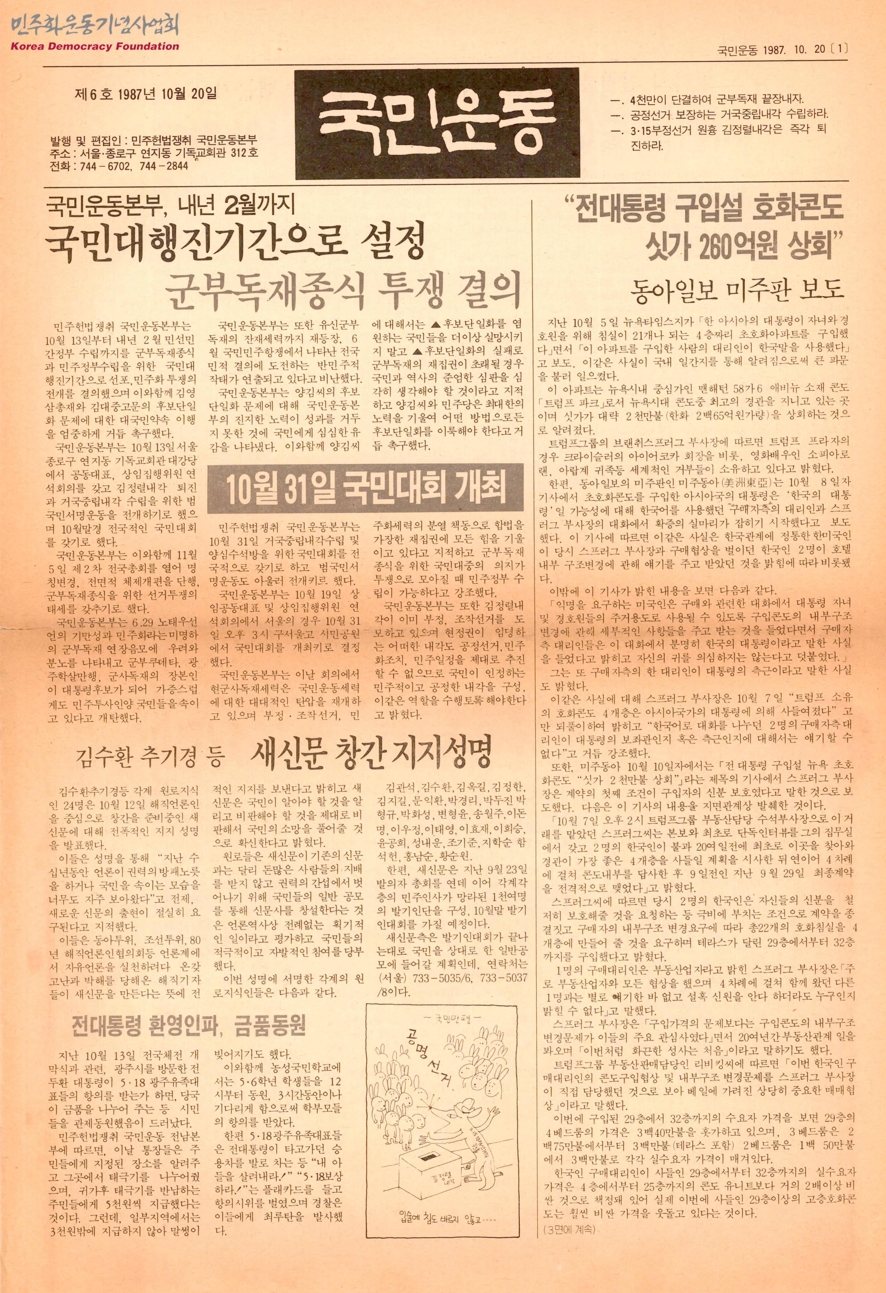 - 1987년 10월 20일 민주헌법쟁취 국민운동본부에서 발행한 국민운동 제6호로 주요 내용은 다음과 같음 -국민운동본부, 내년 2월까지 국민대행진기간으로 설정 군부독재종식 투쟁 결의 -전대통령 구입설 호화콘도 싯가 260억원 상회 -또다시 집권을 노리는 군부독재세력 무엇을 했는가-사람을 죽이는 군부독재는 끝나야 한다 -현내각은 퇴진해야 한다-부정선거사례 잇달아 발생