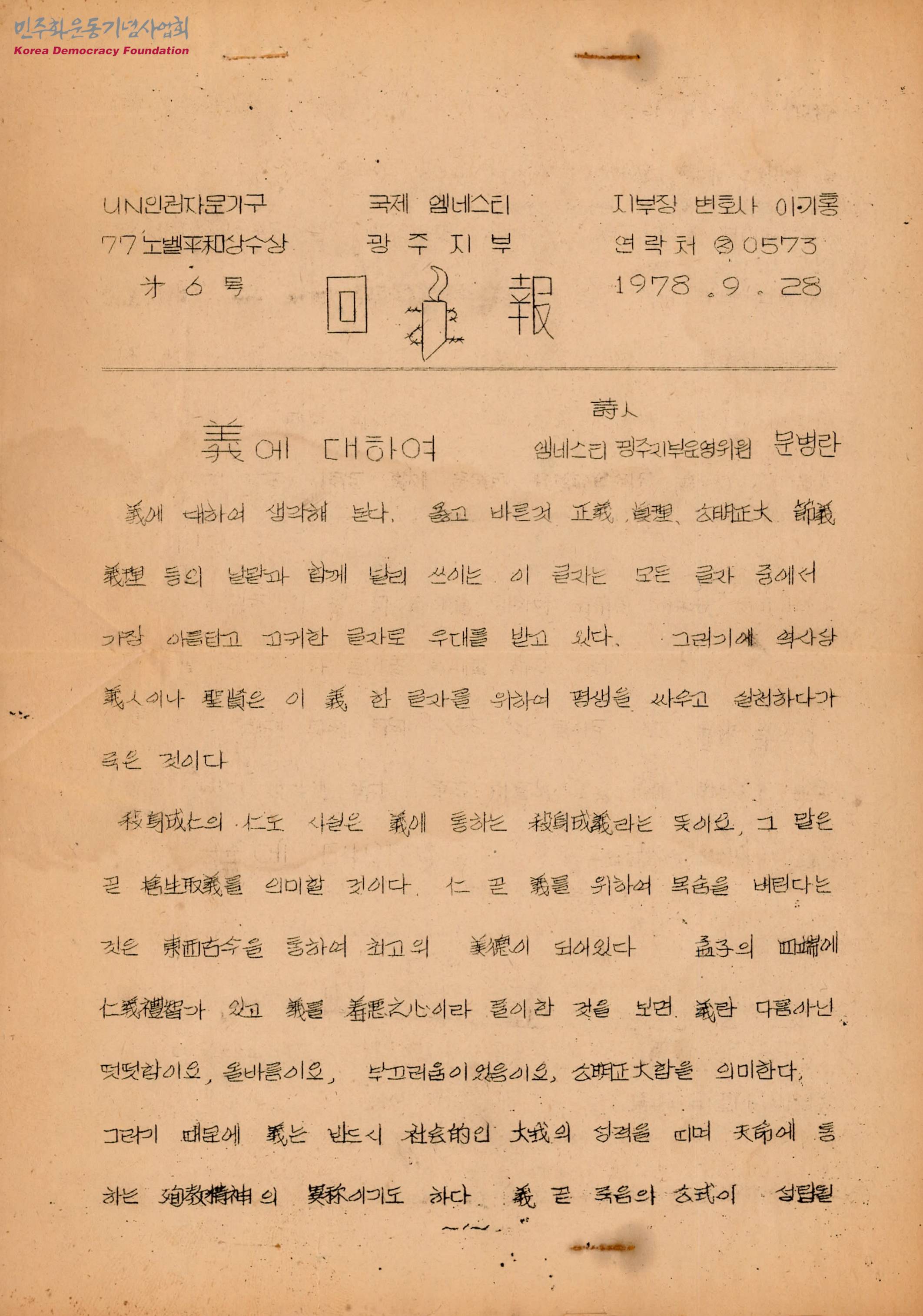 - 떳떳함이자 공명정대함인 '의(義)'에 대한 생각이 적힌 글, 송기숙의 1심공판 최후진술요지 등이 적힌 회보로 시민대표를 지방의회에 보내야 하는 이유가 적힌 리플릿이 첨부되어 있으며 수록된 글은 다음과 같음 -의에 대하여 -지부소식 -양심수인의 동정 -양심범의 최후진술