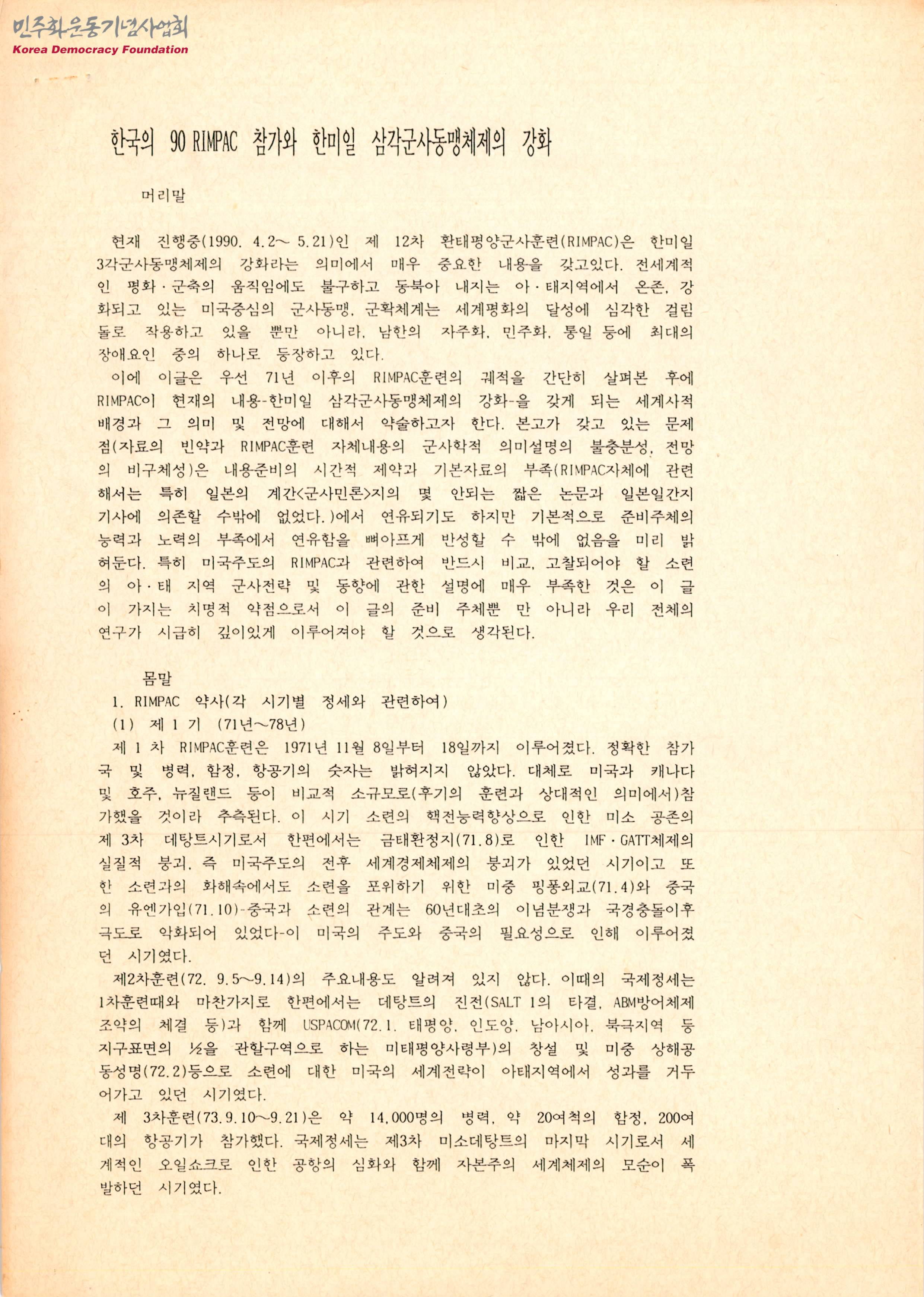 - 현재 진행중인 제12차 환태평양군사훈련은 한미일3각군사동맹체제의 강화라는 의미에서 매우 중요한 내용을 갖고 있으며, 전세계적인 평화·군축의 움직임에도 불구하고 동북아 내지는 아·태 지역에서 온존, 강화되고 있는 미국 중심의 군사동맹, 군확체계는 세계평화의 걸림돌로 작용하며 남한의 자주화, 민주화, 통일 등에 최대의 장애 요인 중 하나로 등장하고 있다는 내용으로, RIMPAC훈련의 궤적을 간단히 살피고, 한미일3각군사동맹체제의 강화를 갖게되는 세계사적 배경과 그 의미 및 전망에 대한 내용 등이 수록된 문서로 주요 내용은 다음과 같음 -머리말 -몸말 1. RIMPAC 약사(각 시기별 정세와 관련하여) 2. 한·미·일삼각안보체제 강화의 배경과 의미 -발말