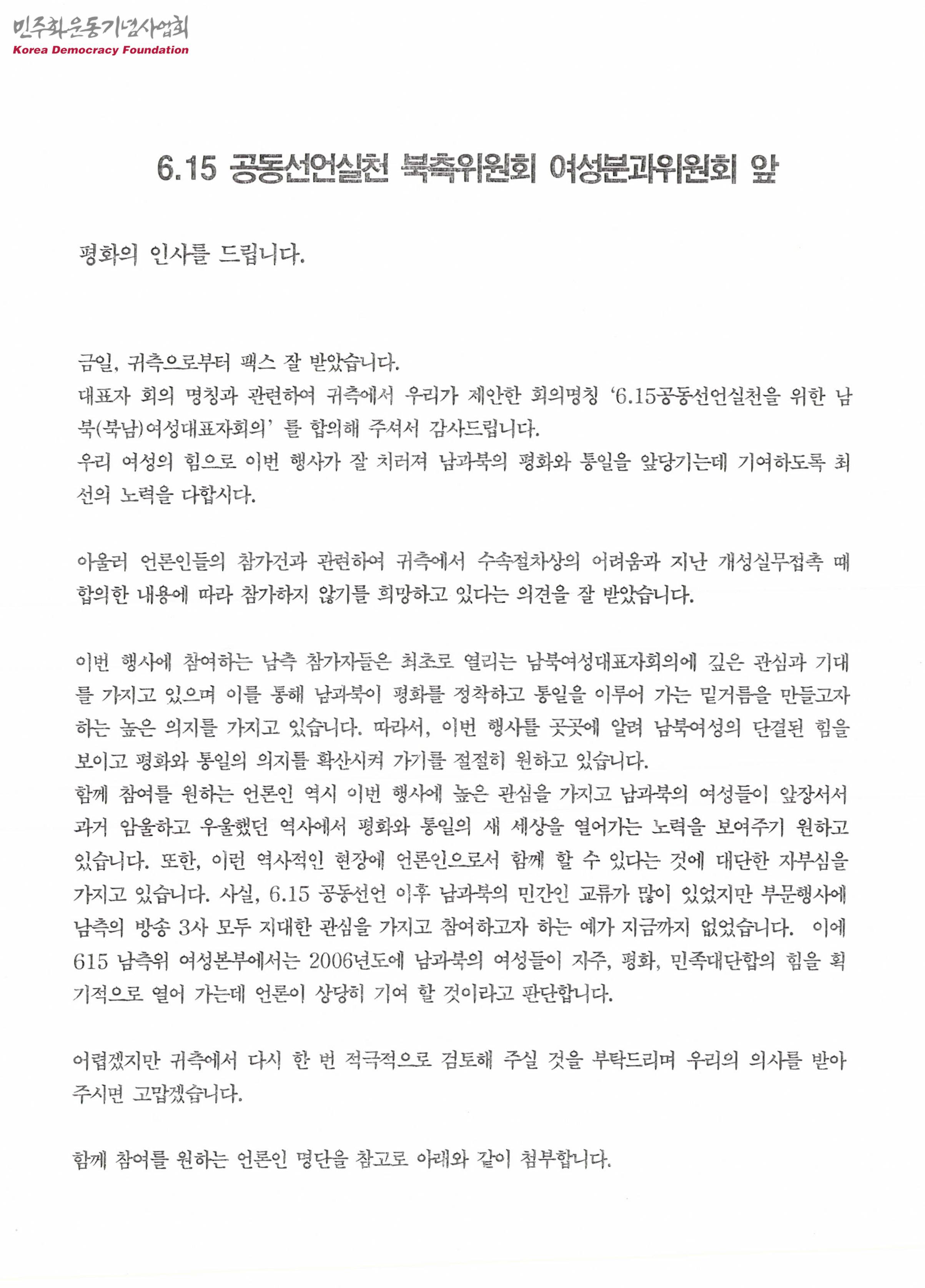 - 대표자회의 명칭과 관련하여 6.15공동선언실천을 위한 남북여성대표자회의로 합의해줘서 감사하다는 내용, 언론인 참가건과 관련하여 수속절차상의 어려움과 개성실무접촉 때 합의한 내용에 따라 참가하지 않기를 희망한다는 의견을 잘 받았으나 이번 행사를 곳곳에 알려 남북여성의 단결된 힘을 보이고 평화와 통일의 의지를 확산시켜 가기를 원하며, 역사적인 현장에 언론인으로서 함께 할 수 있다는 데 자부심을 갖고 있기에 다시 한 번 검토해주기를 바란다는 내용 등이 수록된 문서