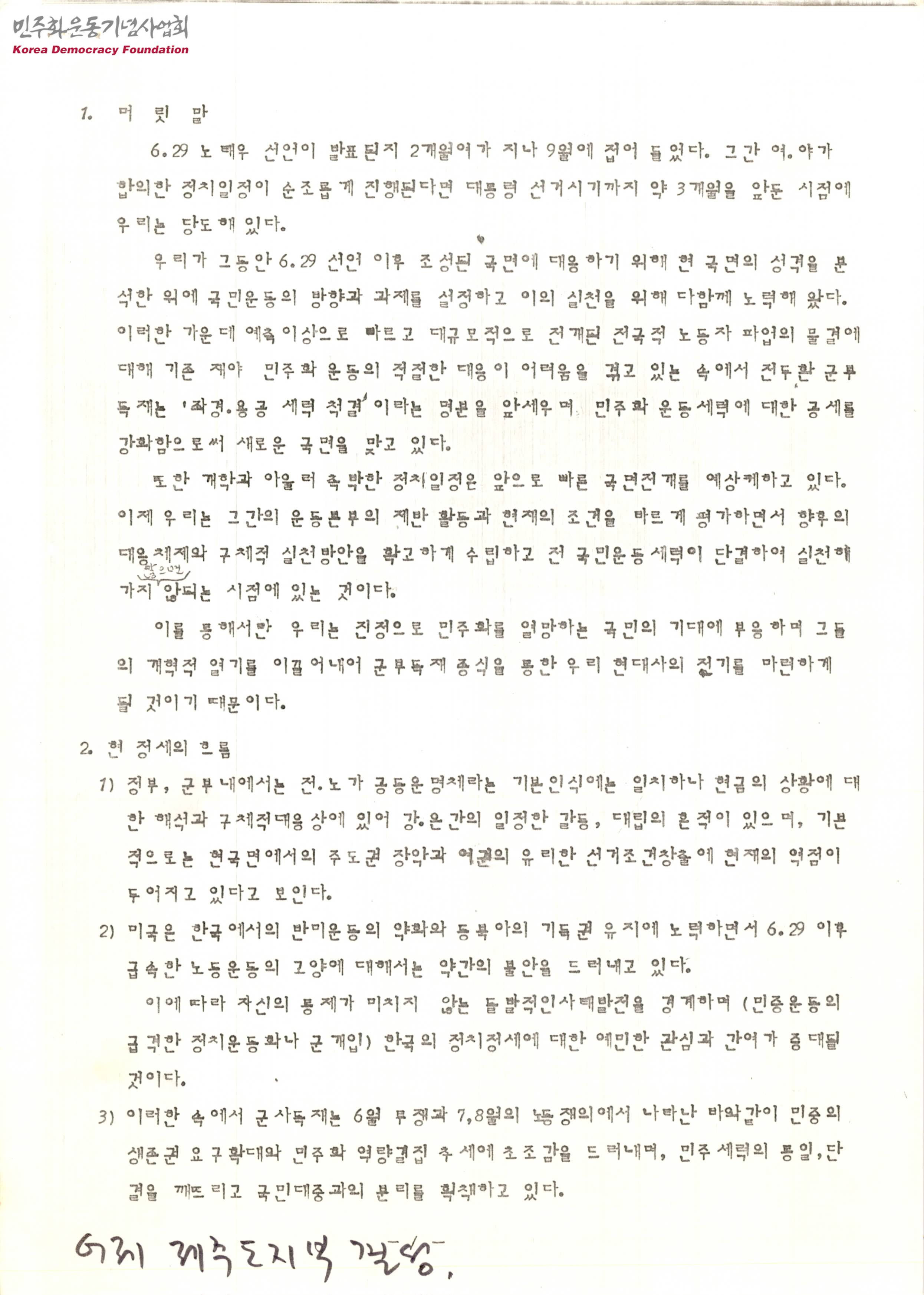 - 6.29선언 이후 조성된 국면에 대응하기 위해 현 국면의 성격을 분석한 위에 국민운동의 방향과 과제를 설정하고 이의 실천을 위해 다함께 노력해 왔으나, 전두환 군부독재는 좌경·용공 세력 척결이라는 명분을 앞세우며 민주화 운동세력에 대한 공세를 강화함으로써 새로운 국면을 맞고 있다는 내용 등이 수록된 문서로 주요 내용은 다음과 같음 1. 머리말 2. 현 정세의 흐름 3. 7, 8월 국민운동본부의 활동평가 4. 운동본부의 해결과제 및 대응 방향