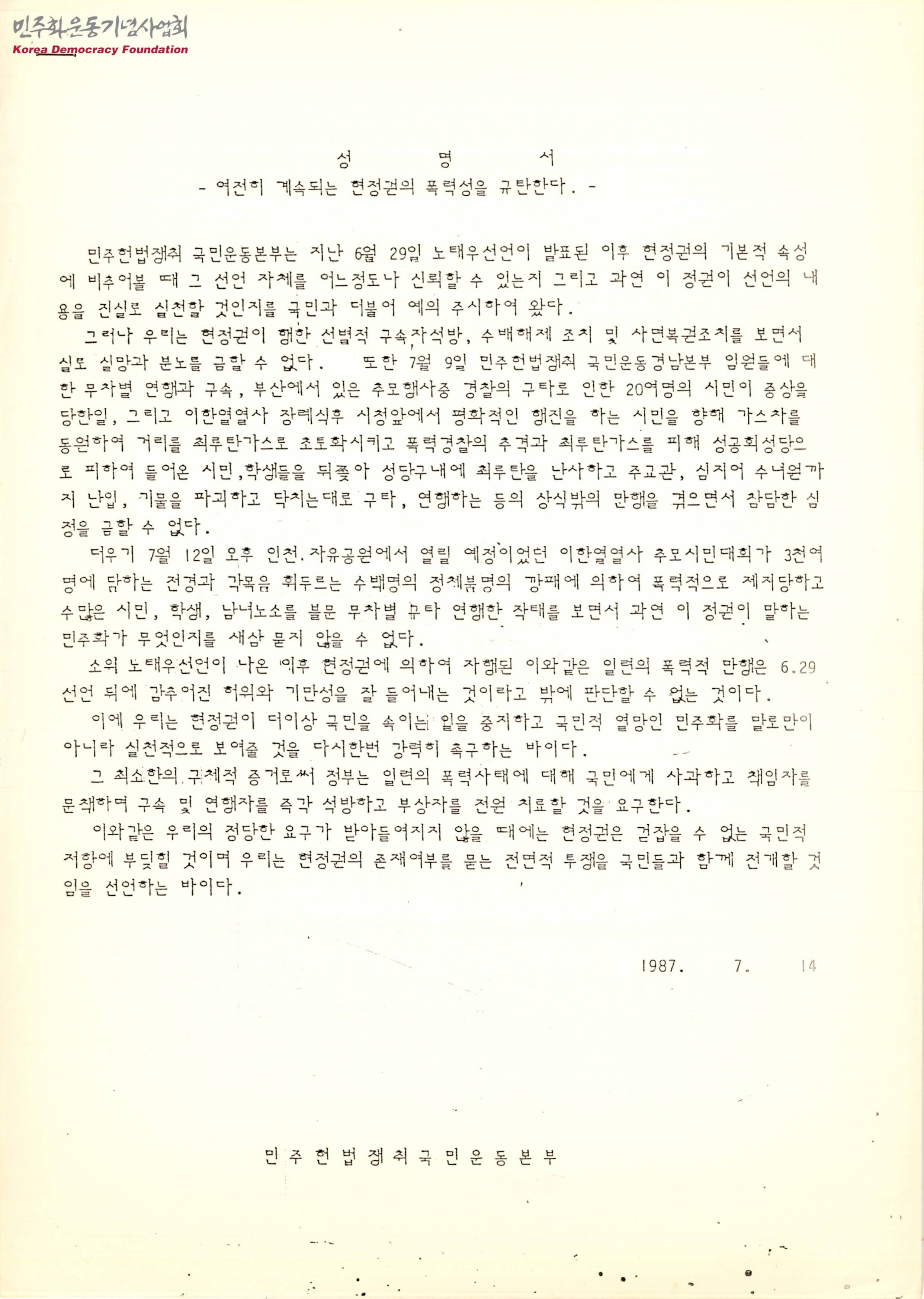 - 6.29선언이 나온 이후 현정권에 의하여 자행된 일련의 폭력적 만행은 6.29선언 뒤에 감추어진 허위와 기만성을 잘 드러내는 것이며, 현정권이 더 이상 국민을 속이는 일을 중지하고 국민적 열망인 민주화를 말로만이 아닌 실천적으로 보여줄 것을 다시한번 강력히 촉구하며, 일련의 폭력사태에 대해 국민에게 사과하고 책임자를 문책하여 구속 및 연행자를 즉각 석방하고 부상자를 전원 치료할 것을 요구하는 내용 등이 수록된 문서