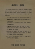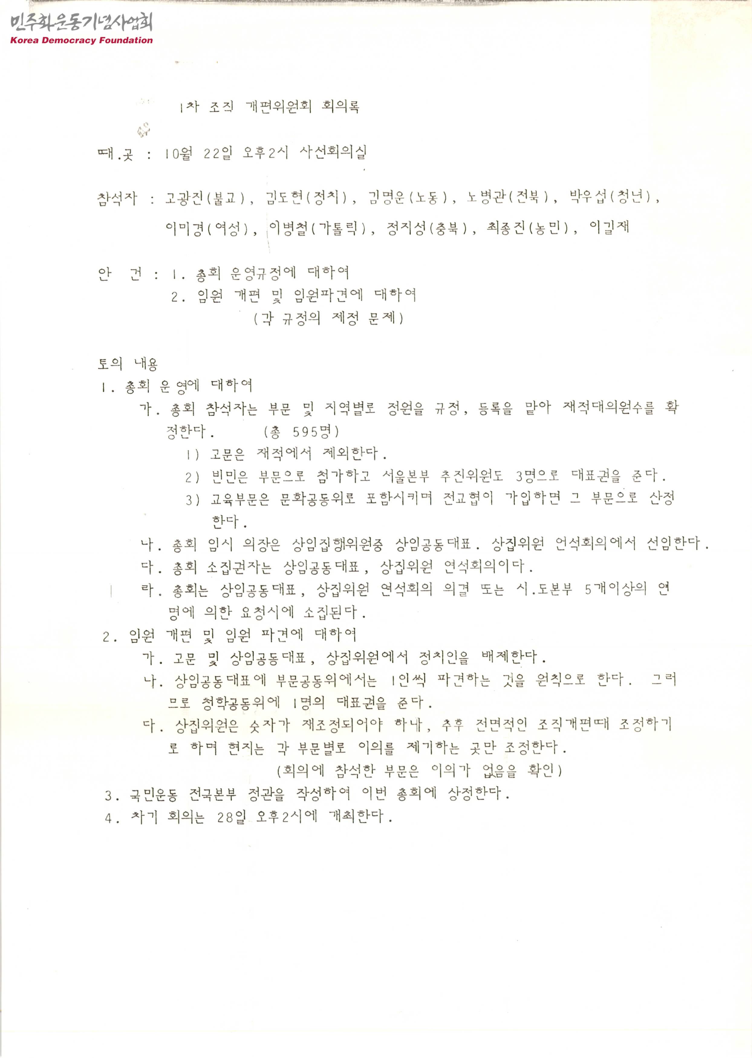 - 민주헌법쟁취국민운동본부의 1차 조직 개편위원회 회의록으로 회의의 일시 및 장소, 참석자, 안건, 토의 내용 등의 내용이 수록되어 있으며 안건 및 토의 내용은 다음과 같음 -안건1: 총회 운영규정에 대하여 -안건2: 임원 개편 및 임원파견에 대하여 -토의 내용1: 총회 운영에 대하여 -토의 내용2: 임원 개편 및 임원 파견에 대하여 -토의 내용3: 국민운동 전국본부 정관을 작성하여 이번 총회에서 상정한다 -토의 내용4: 차기 회의는 28일 오후 2시에 개최한다