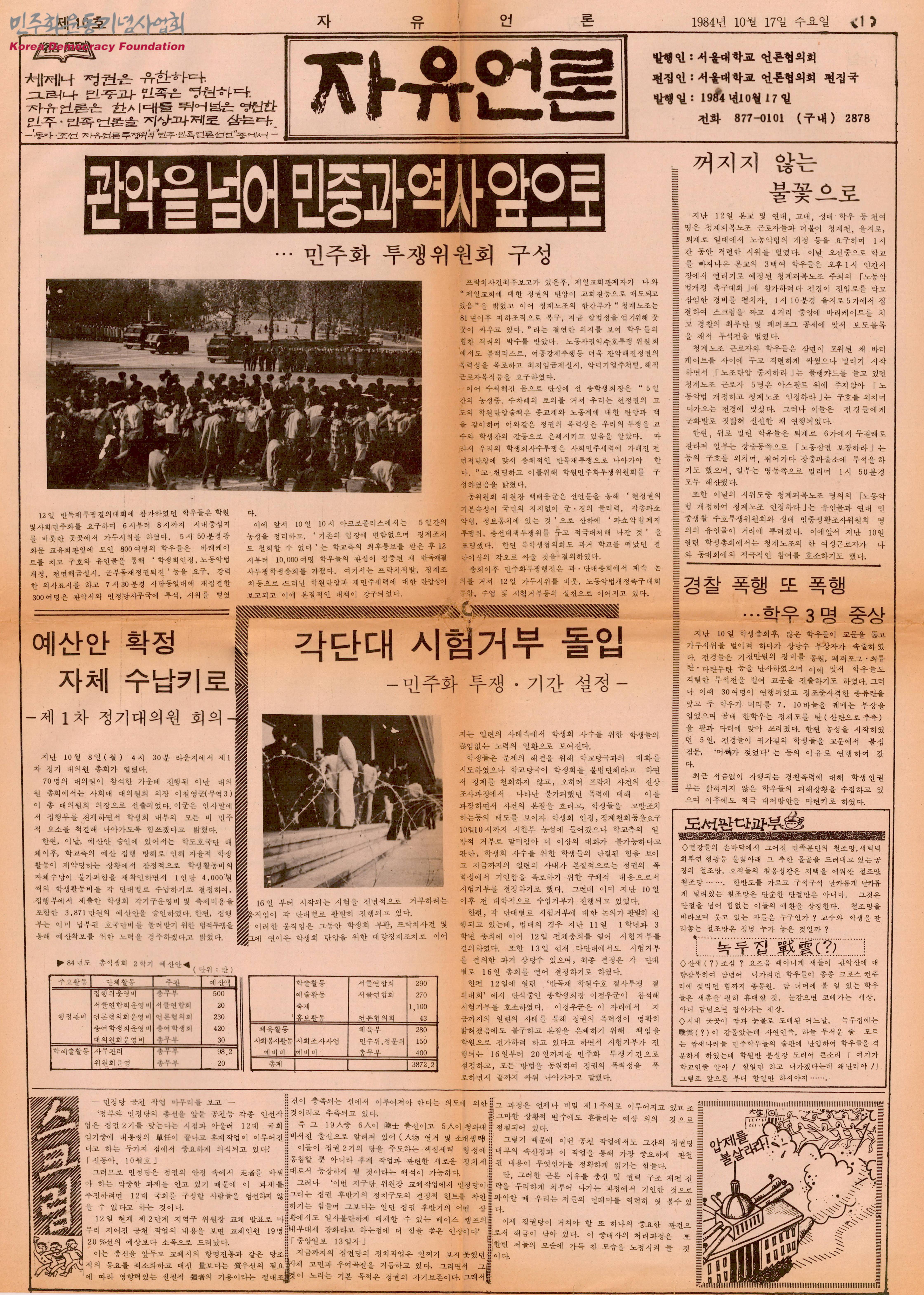 - 반독재투쟁결의대회에 참가하였던 학우들은 학원 및 사회민주화를 요구하며 시내중심지를 비롯한 곳곳에서 가두시위를 하였다는 내용, 1천여 명의 학생이 청계피복노조 근로자들과 더불어 노동악법의 개정 등을 요구하며 1시간 동안 격렬한 시위를 벌였다는 내용, 각 단대별로 시험을 전면적으로 거부하려는 움직임이 활발히 진행되고 있다는 내용 등이 수록된 문서