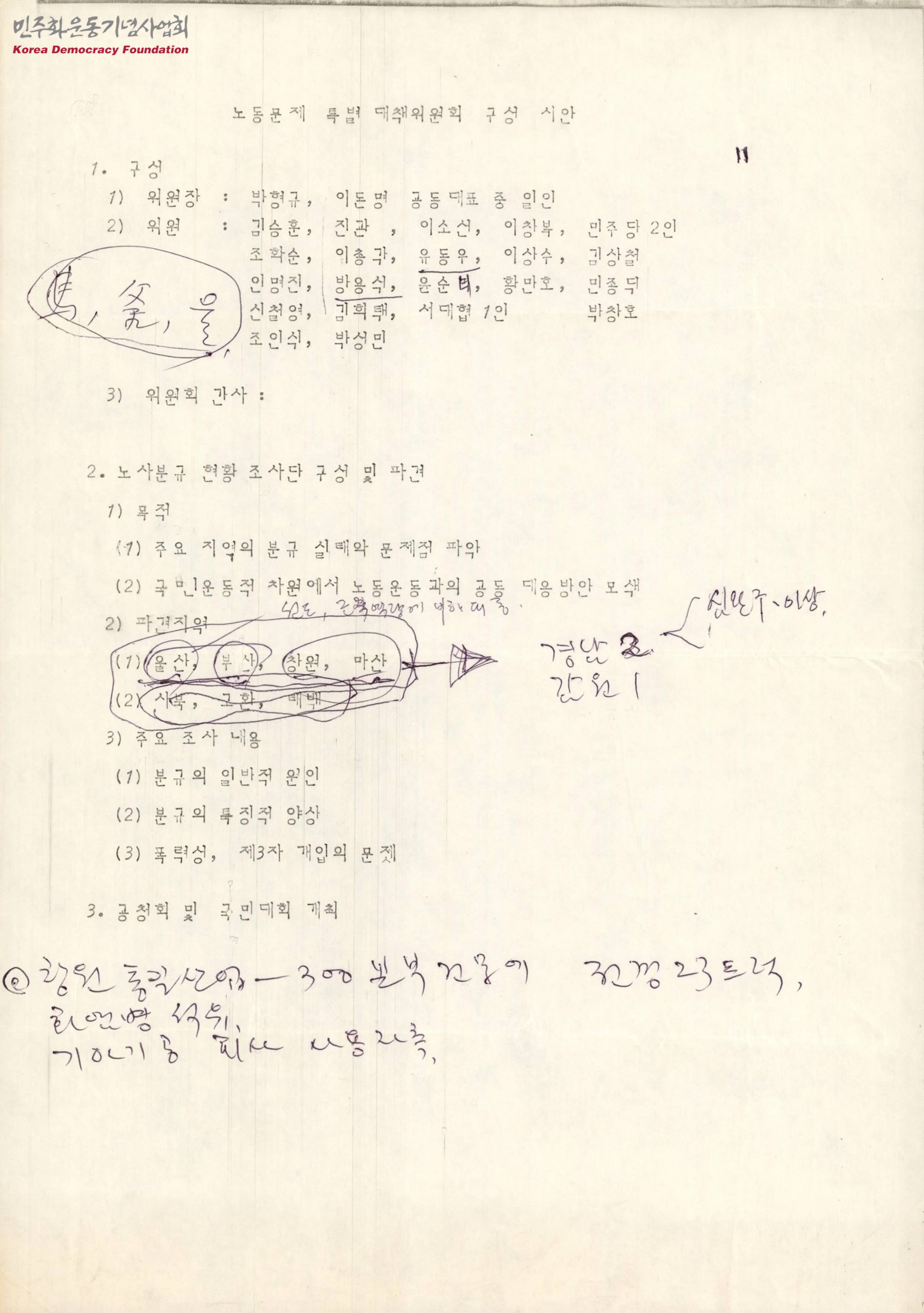 - 주요 지역의 분규실태와 문제점을 파악하고 국민운동적 차원에서 노동운동과의 공동 대응방안을 모색하기 위해 만들어진 노동문제 특별대책위원회 구성 시안으로 주요 내용은 다음과 같음 1. 구성 2. 노사분규 현황 조사단 구성 및 파견 3. 공청회 및 국민대회 개최
