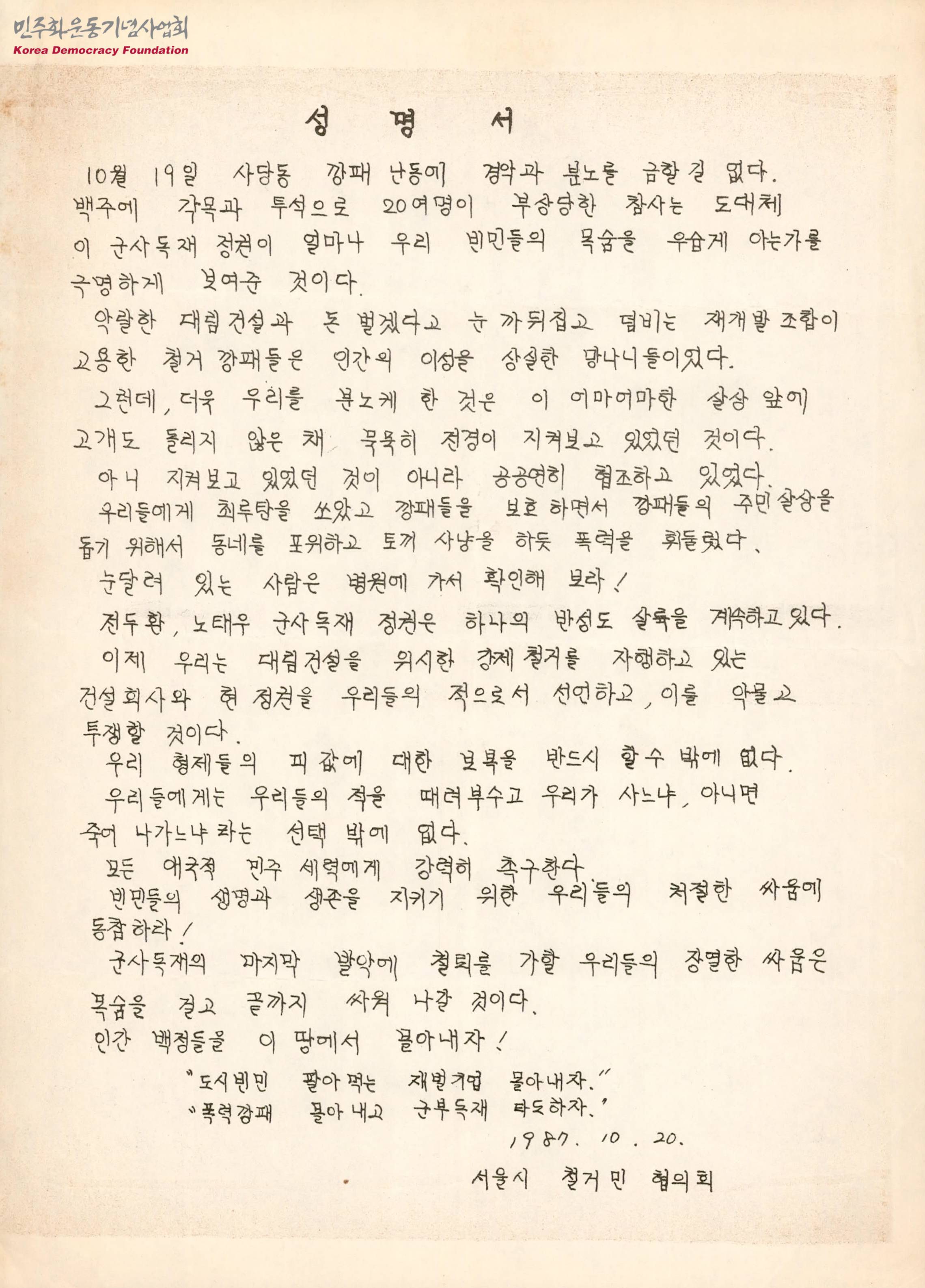 - 사당동 깡패 난동과 이를 묵묵히 지켜보고 있는 전경을 비판하며 대림건설을 위시한 강제철거를 자행하고 있는 건설회사와 현 정권을 우리들의 적으로 선언하고 이를 악물고 투쟁할 것이며, 빈민들의 생명과 생존을 지키기 위한 처절한 싸움에 동참하자고 모든 애국적 민주 세력에게 강력히 촉구하는 내용 등이 수록된 문서