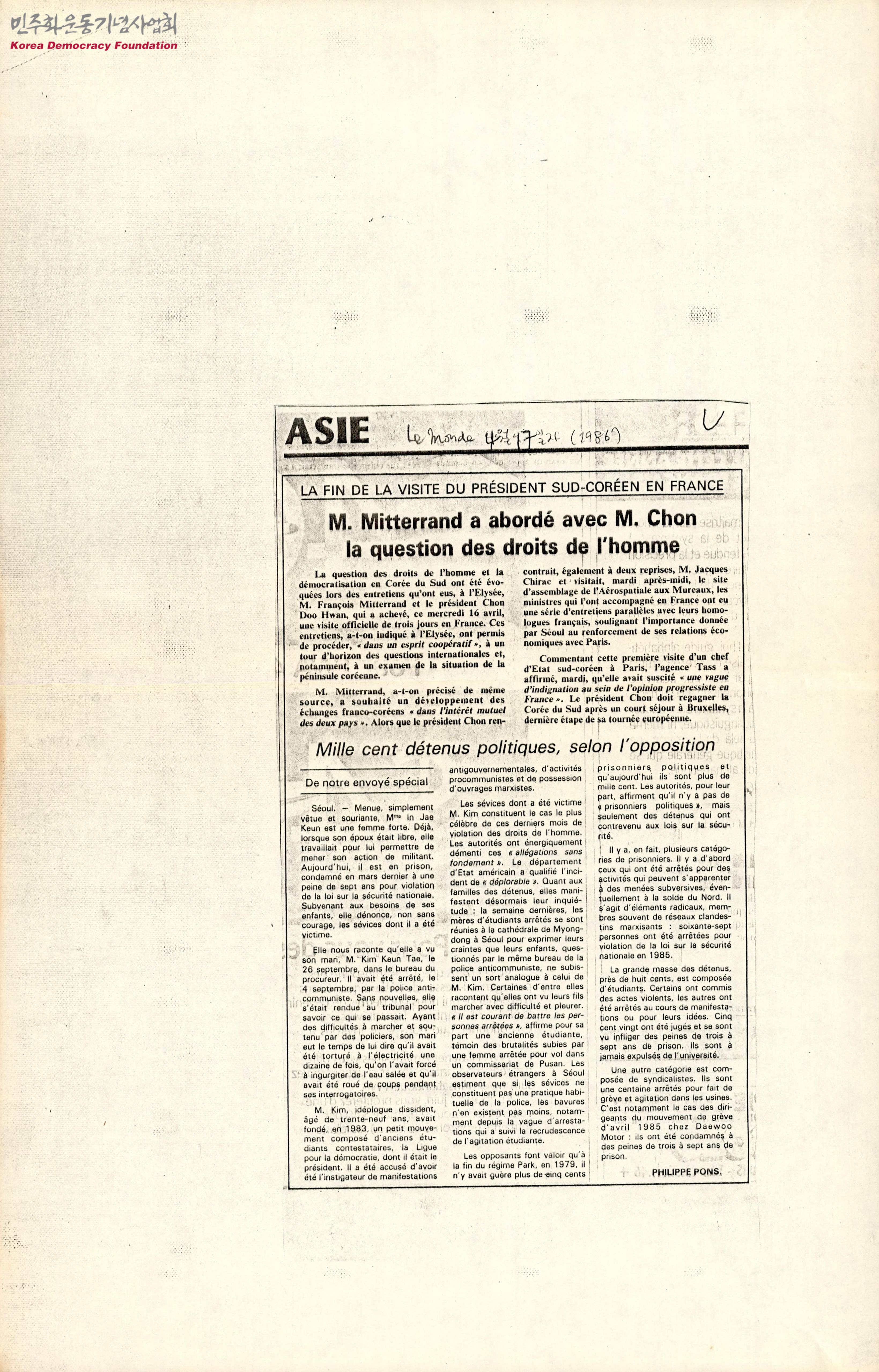 [신문스크랩]M.Mitterrand a aborde avec M.Chon la question des droits de I'HOMME