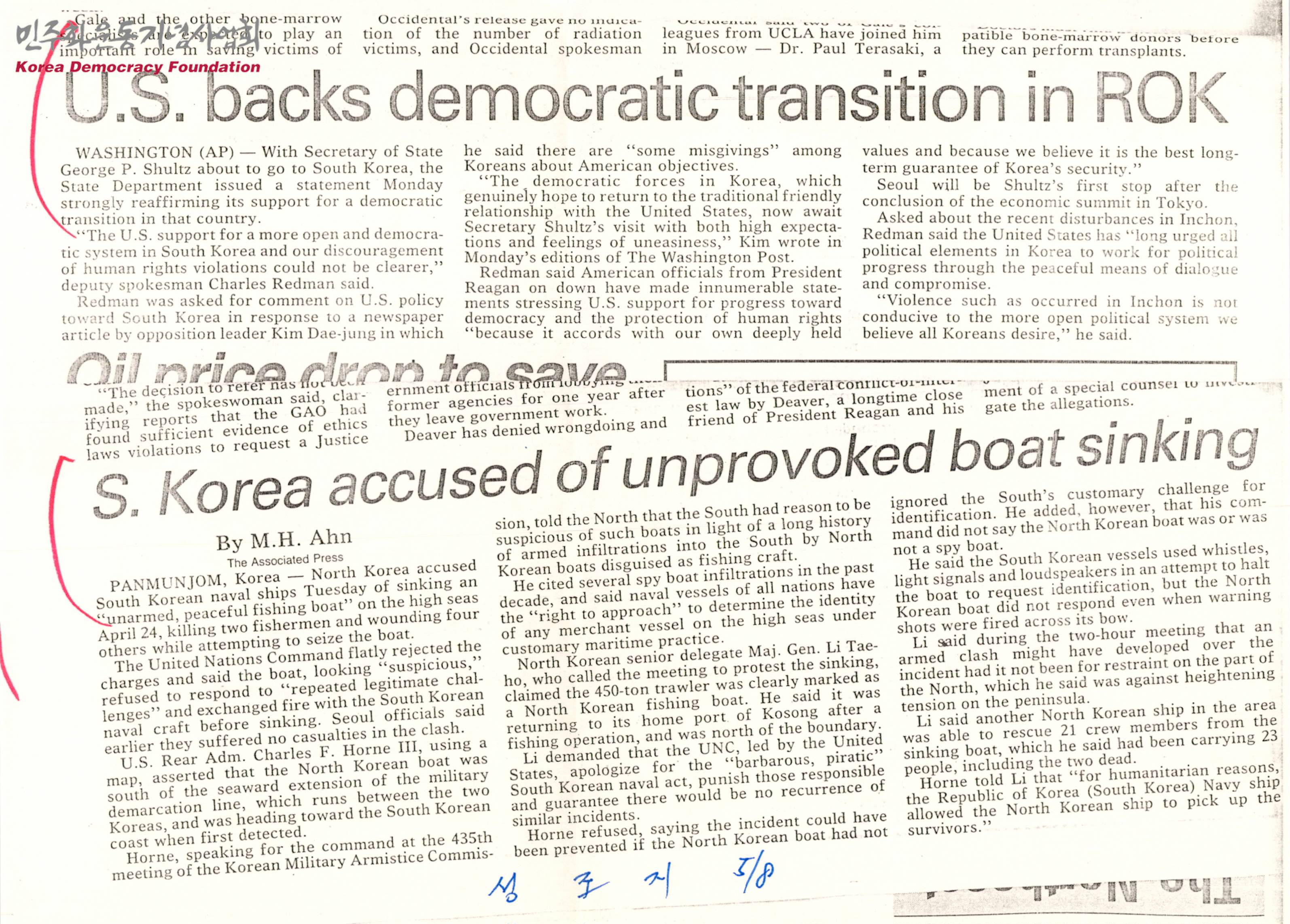 - 슐츠 미 국무장관이 방한을 앞두고 찰스 레드먼 부대변인은 한국의 보다 개방적이고 민주적인 체제에 대한 미국의 지지와 인권 침해에 대한 우리의 반대는 이보다 더 명확할 수 없다며 한국의 민주적 전환에 대한 지지를 재확인했다는 내용, 북한 어선이 반복되는 합법적인 호출에도 응하지 않아 한국 해군이 침몰시킨 것을 북한이 비난한 내용 등이 수록된 문서 모음