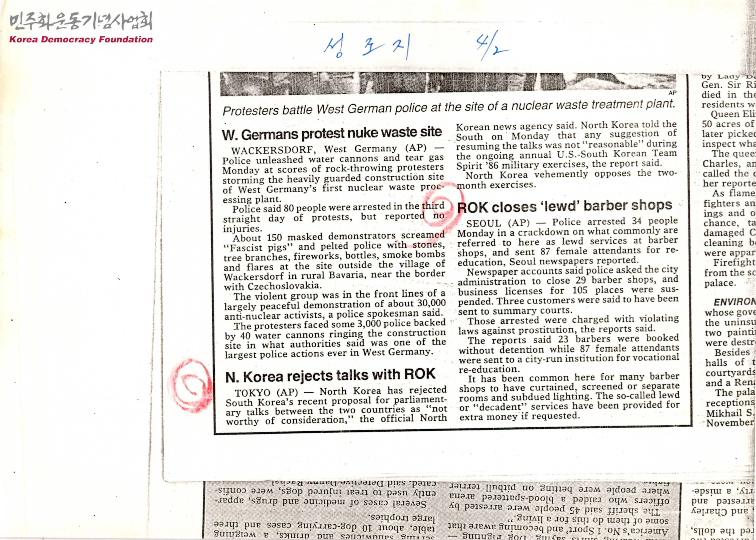 - 북한은 최근 남한의 국회 회담 제안에 대해 고려할 가치가 없다고 거부했으며, 한국에서 진행중인 한미 팀스피리트 군사 훈련 기간에 회담을 재개하자는 제안은 합리적이지 않고 두 달에 걸친 훈련에 격렬하게 반대하고 있다는 내용, 한국에서 한 이발소에서 음란한 서비스로 불리는 영업을 단속하여 34명을 체포하고 87명의 종업원을 송치했으며 이들은 성매매 금지법 위반 혐의로 기소되었다는 내용 등이 수록된 문서 모음