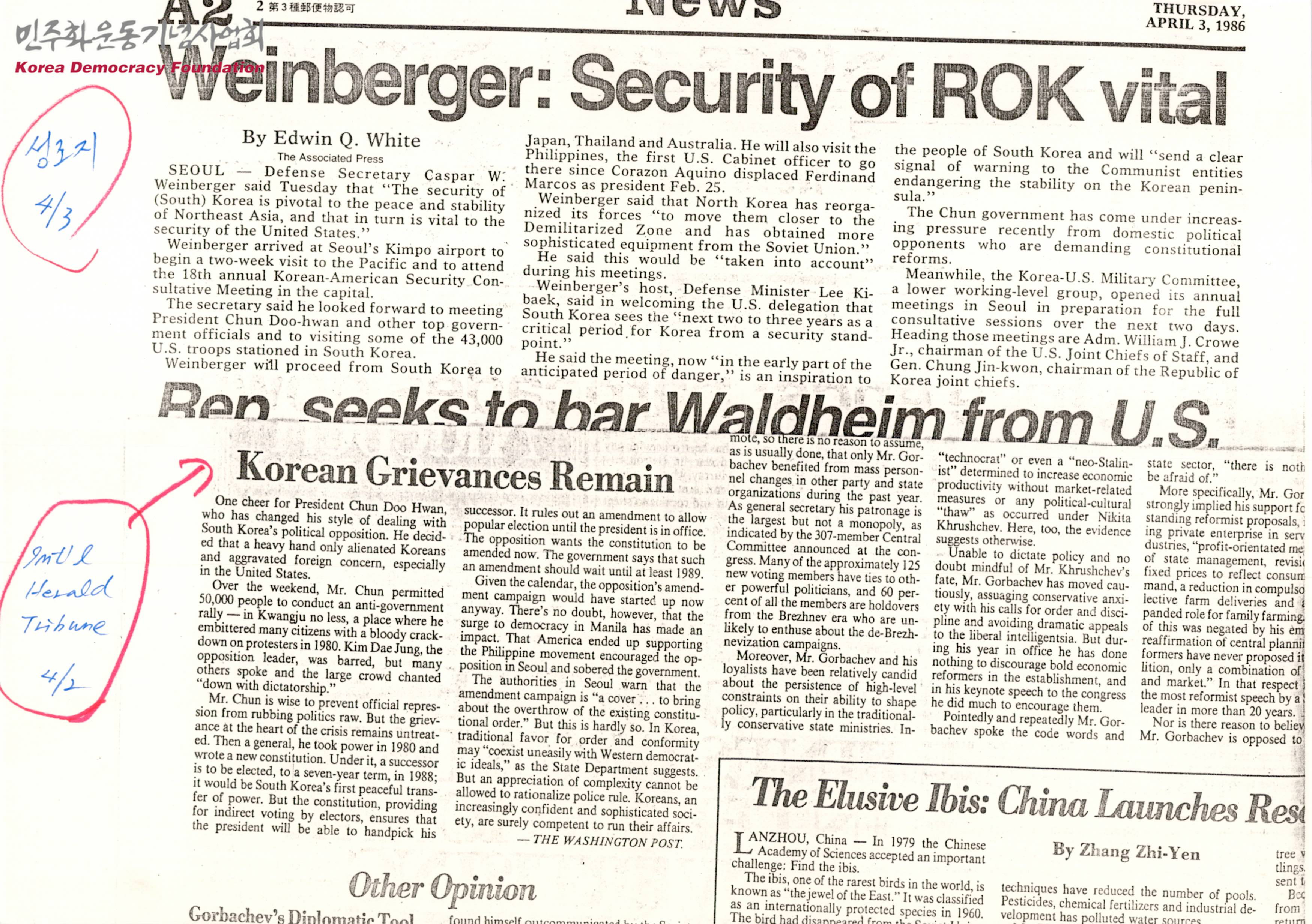 - 캐스퍼 와인버거 미 국방장관은 한국 안보가 동북아시아의 평화와 안정에 중추적이며 이는 곧 미국의 안보에도 필수적이라고 말했으며, 이기백 국방부 장관은 미국 대표단을 환영하는 자리에서 한국은 향후 2~3년이 안보 측면에서 가장 중요한 시기라고 보고 있다는 내용, 전두환 정권은 최근 개헌을 요구하는 국내 정치 반대 세력으로부터 점점 더 많은 압력을 받고 있다는 내용 등이 수록된 문서