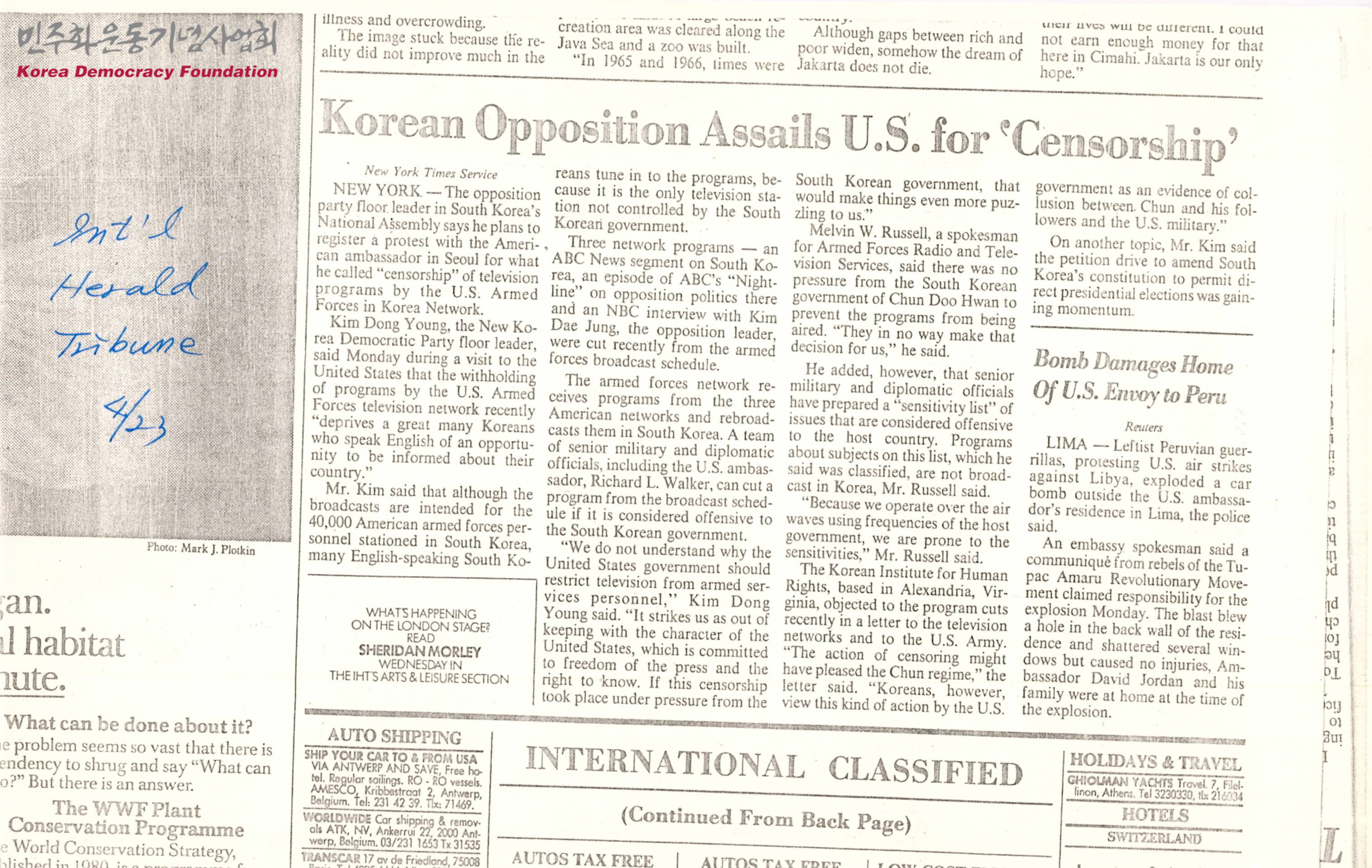 [신문스크랩]Korean Opposition Assails U.S. for 'Censorship'