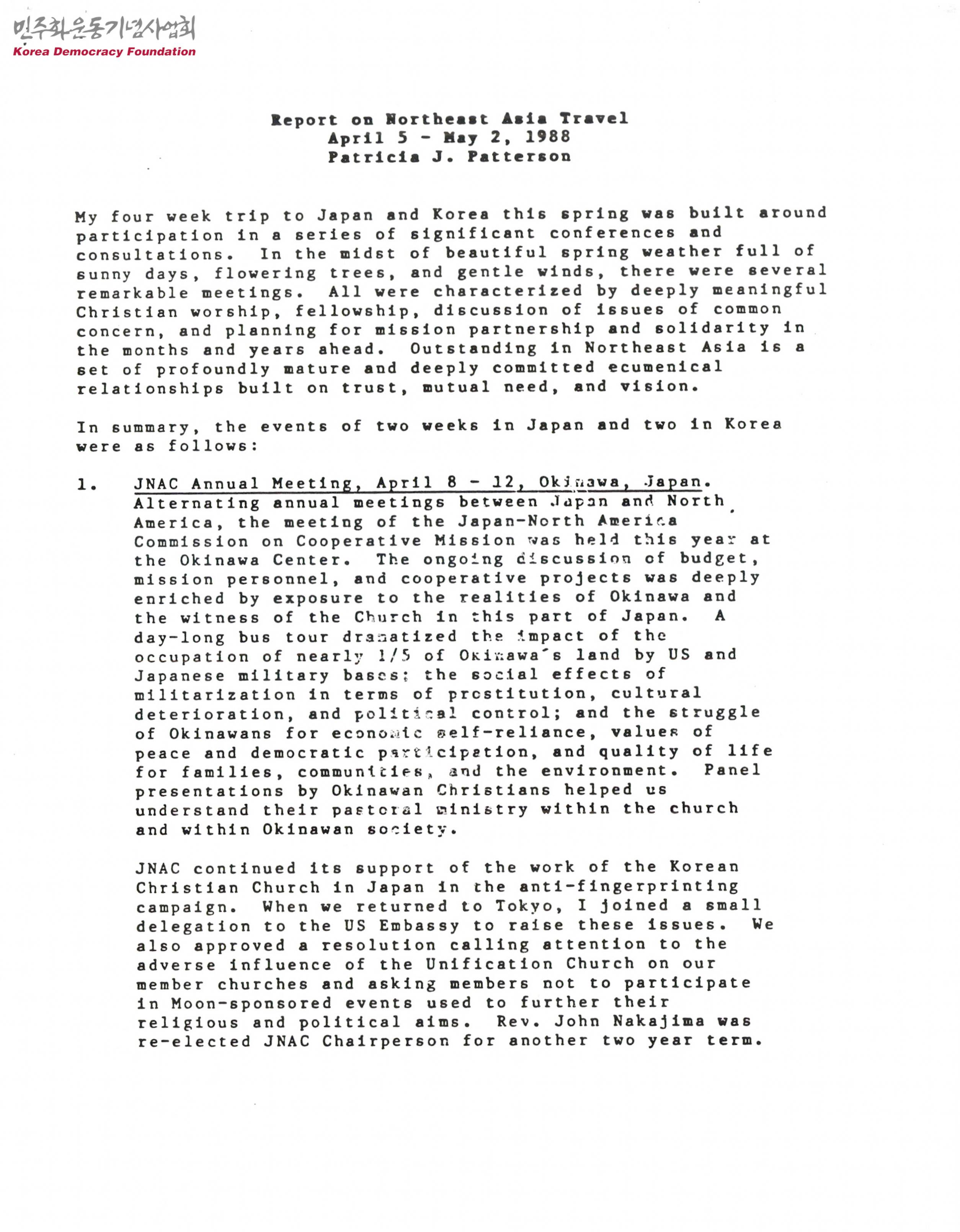 - 기독교적 예배와 동료애, 몇 달 동안의 선교의 동반적 협력과 연대를 위해 한국과 일본을 방문한 Pat Patterson의 각 나라에서의 2주간의 사건이 정리되어 있는 문서로 오키나와에서 일본과 북미 협동임무수행위원회를 만났다는 것, 인천에서 한국의 정의와 평화를 위한 국제 기독교 협의회를 만났다는 것 등의 내용이 적혀있음