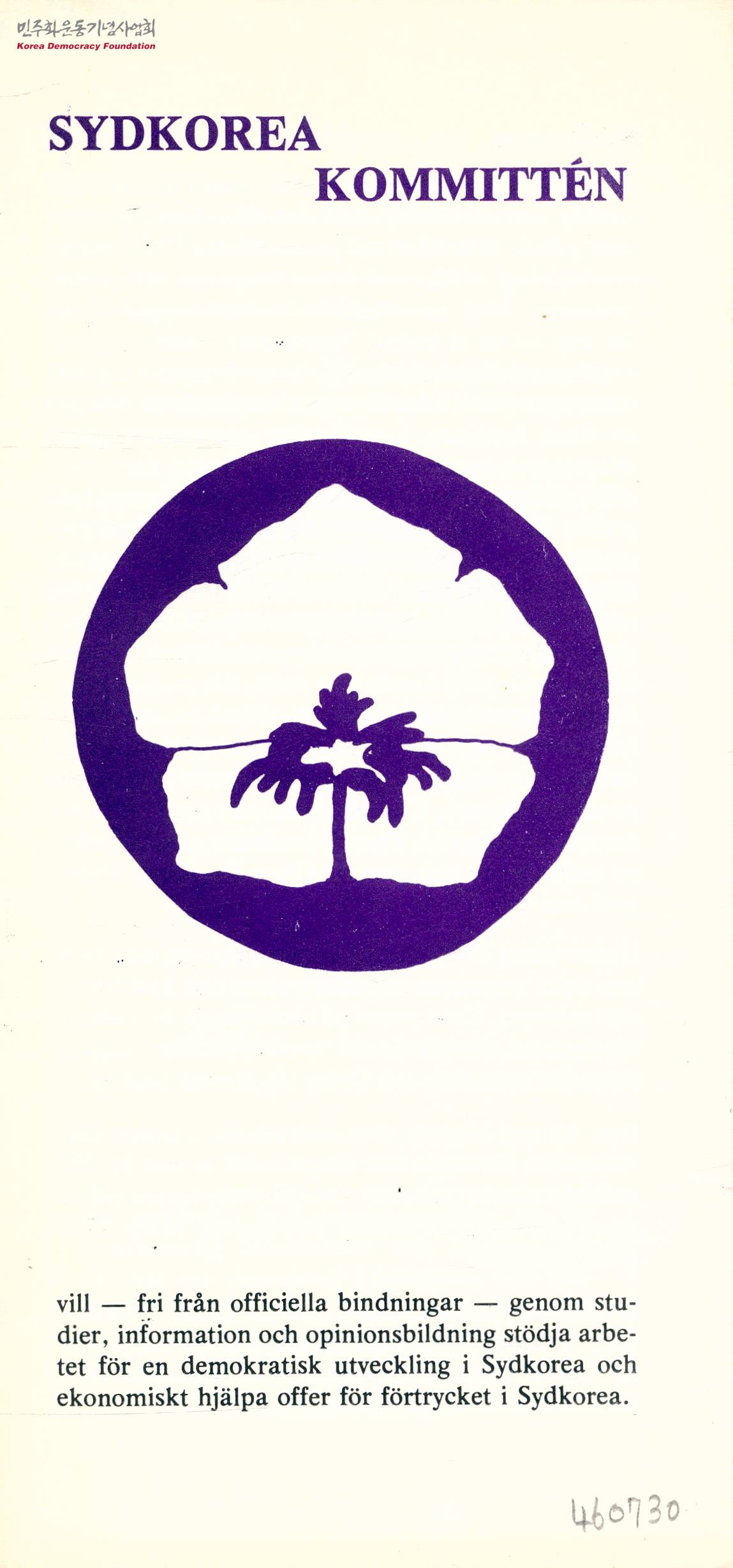 - 한국의 민주적 발전을 지원하기 위한 스웨덴의 노력을 조정해야 할 필요성을 느껴 결성된 한국위원회를 소개하는 리플릿으로 한국위원회의 목적, 한국과 스웨덴의 관계, 한국에 관한 사실, 한국 민주화 운동의 역사 등이 수록됨