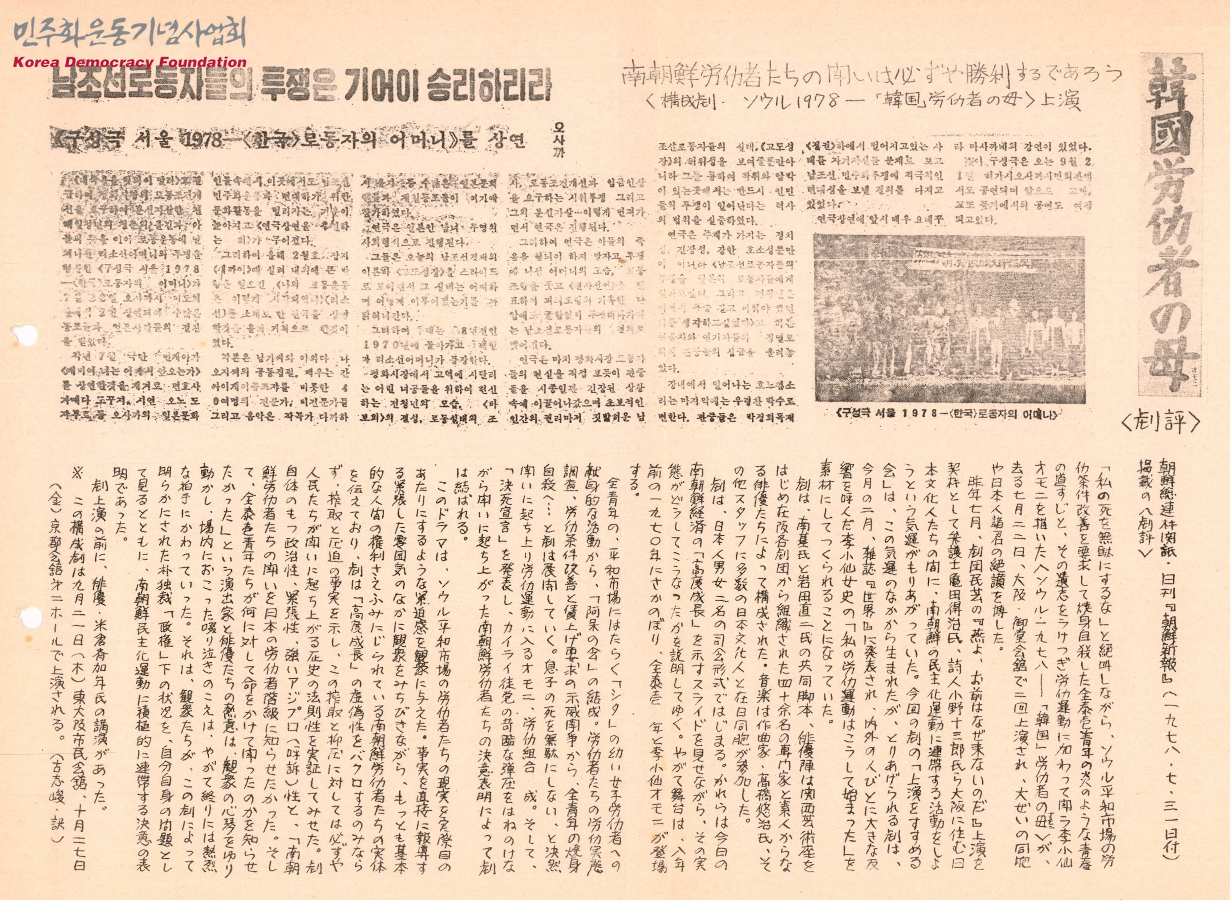 - 전태일과 그의 어머니 이소선의 투쟁을 담은 구성극 "서울 1978 한국 로동자의 어머니"가 오사카에서 상연되었다는 소식과 연극의 진행내용, 관객들의 반응, 향후 다른 지역에서도 공연될 예정임을 전하는 내용이 담긴 기사의 스크랩과 해당 스크랩이 일본어로 번역된 글이 실려있는 문서