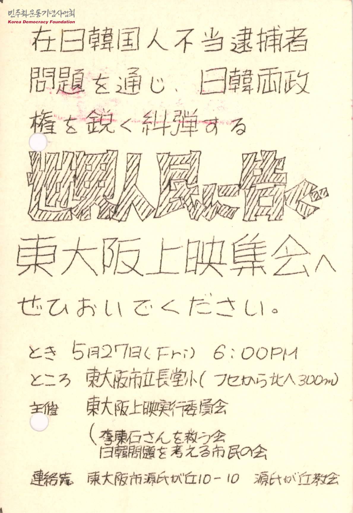 [히가시오사카 상영 실행 위원회가 요시모토 쇼오지에게 보낸 재일교포 부당체보 규탄행사 관련 초청 엽서]